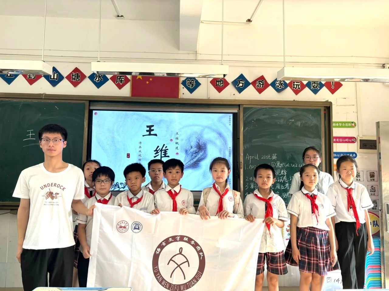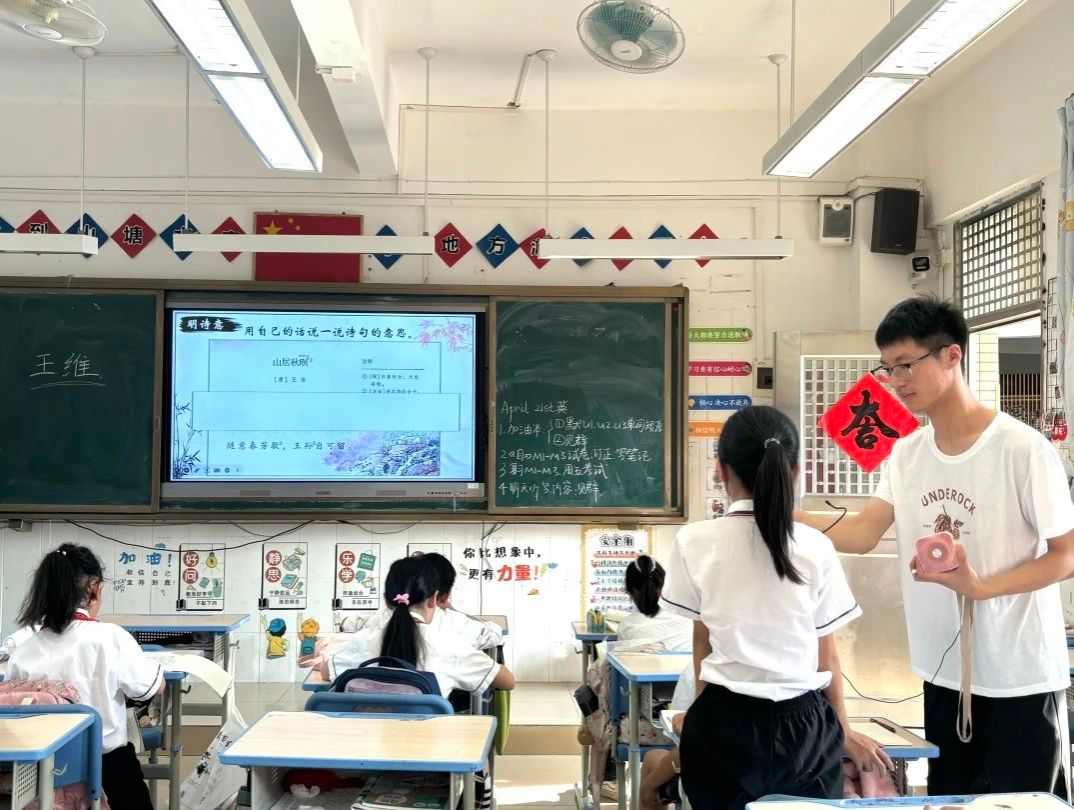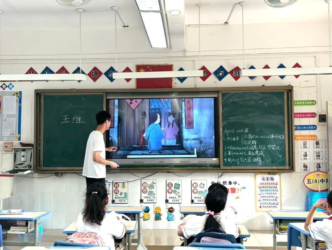 课堂伊始,小老师张家乐以王维名作《相思》的视频为引,视频中落叶纷飞、秋水潺潺的画面瞬间激发了孩子们的好奇心。随后,小张老师从“诗佛”王维的生平讲起,结合盛唐佛教背景,剖析其诗作中禅意与自然的交融。解读诗题时,“山居”与“秋暝”的意境被层层展开,孩子们在朗朗诵读声中,仿佛置身空山新雨后的松间月下,耳畔清泉叮咚,眼前莲动渔舟。