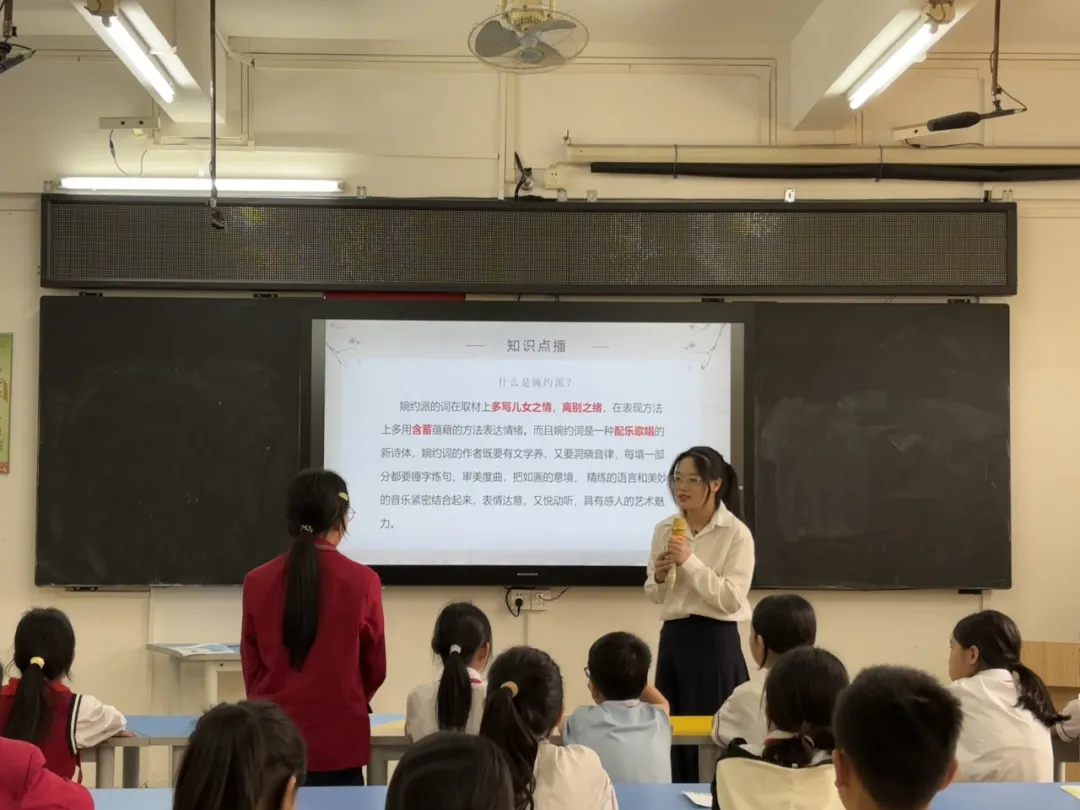 讲解李清照的雅号时,小李老师首先提问同学们是否知道“易安居士”的由来。接着,她带领同学们一起穿越时空,回到李清照为自己起雅号的年代。通过小李老师生动地讲解,同学们了解到“易安居士”这个雅号来源于陶渊明《归去来兮辞》中的“倚南窗以寄傲,审容膝之易安”。这不仅是李清照与赵明诚爱情的见证,更是她对心安之处的追求。随后,小李老师又抛出一个问题:有谁知道什么是婉约派吗?“婉约”这个词给你们什么感觉呢?是温柔、直爽还是豪放?同学们异口同声答道:“温柔!”借着同学们的回答,小李老师仔细地为同学们阐释了婉约派的定义及其艺术特色。