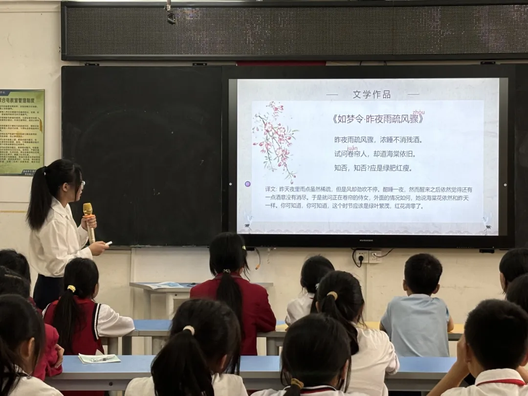 课堂互动环节,小李老师与同学们一起品读李清照所写的作品。通过朗读赏析、视频播放等方式,同学们身临其境地体会到“昨夜雨疏风骤”的意境和“常记溪亭日暮”的闲适。课堂的最后,通过引述历代文人如朱彧、胡仔和朱熹等人对李清照的评价,让同学们深刻地认识到李清照的才华洋溢以及超凡的艺术造诣。