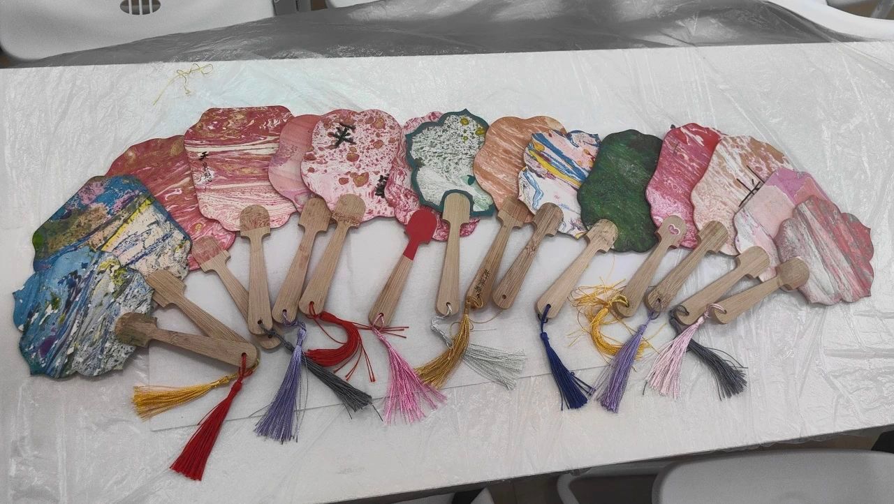 当把同学们制作完成的风格各异的漆扇一字排开,宛如一场流动的东方艺术展,每一把都承载着同学们的巧思与热情,让非遗之美在指尖焕发新生。