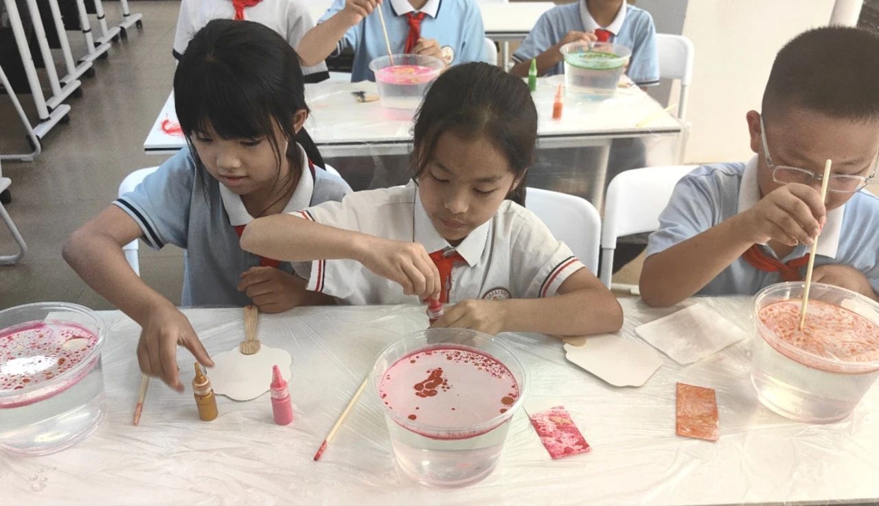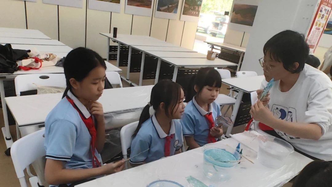 在实践课堂,小陈老师首先给同学们回顾了漆扇的制作步骤,在小助手的帮助下,同学们开始了期待许久的实践环节。同学们手持素白扇面,屏息凝神,轻轻浸入流动的漆液,提扇的瞬间——色彩如云霞般在扇上绽放,引得阵阵惊叹。“我的扇子像水墨画!”“看,我的像星空!”欢快的讨论声此起彼伏。