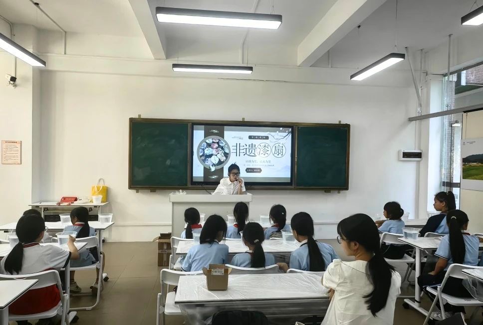 当讲到漆扇的制作工艺时,同学们忍不住模仿起下扇的手势。随后,小陈老师讲解了漆扇制作的配色要诀,以深色为主基调,搭配1-2种辅色,通过巧妙的色彩组合制作出独一无二的扇面纹路。同学们听得入神,满心期待下一节的实践课堂。