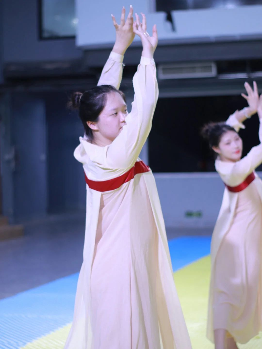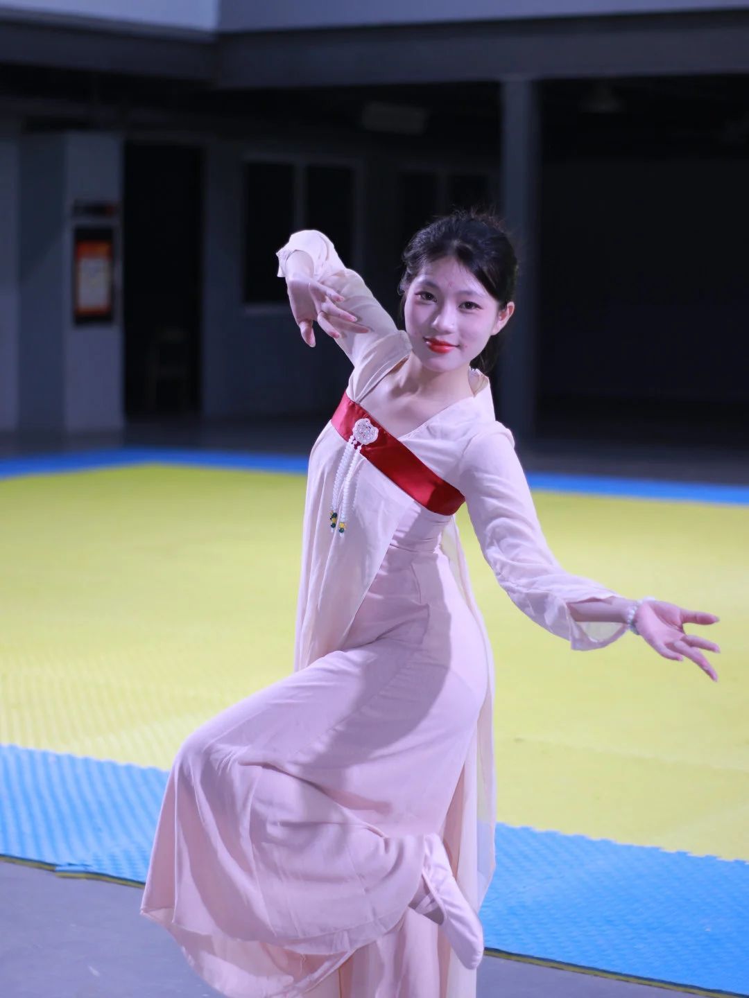 本次课程将李白的诗篇《清平调》巧妙融入舞蹈语汇“名花倾国两相欢……”这一句,化作了舞步中一个深情的凝望与回旋,是杨玉环眸的惊鸿一瞥。用肢体语言解读杨贵妃的绝代风华与命运流转。学员们虽起步于零基础,却在小老师的细致拆解下从汉唐舞的典雅手位、圆润步伐学起,在动静之间触摸盛唐气韵。