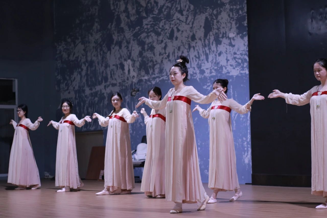 小老师在教学前对舞蹈的深刻内涵进行了一一解读,化为一个个具体的呼吸、眼神、指尖的颤动。诗与舞,在这里真正实现了“一体”,学员们用身体“写”下了对杨贵妃一生的理解。结课之际,学员们身着淡雅汉服,面染古典妆容,在悠扬乐声中自信登台。他们虽无专业舞者的技巧,却以真挚的投入和显著进步,实现了从文化爱好者到古典舞传承者的华丽蜕变,好似每一位同学都成为了一次“杨贵妃”。