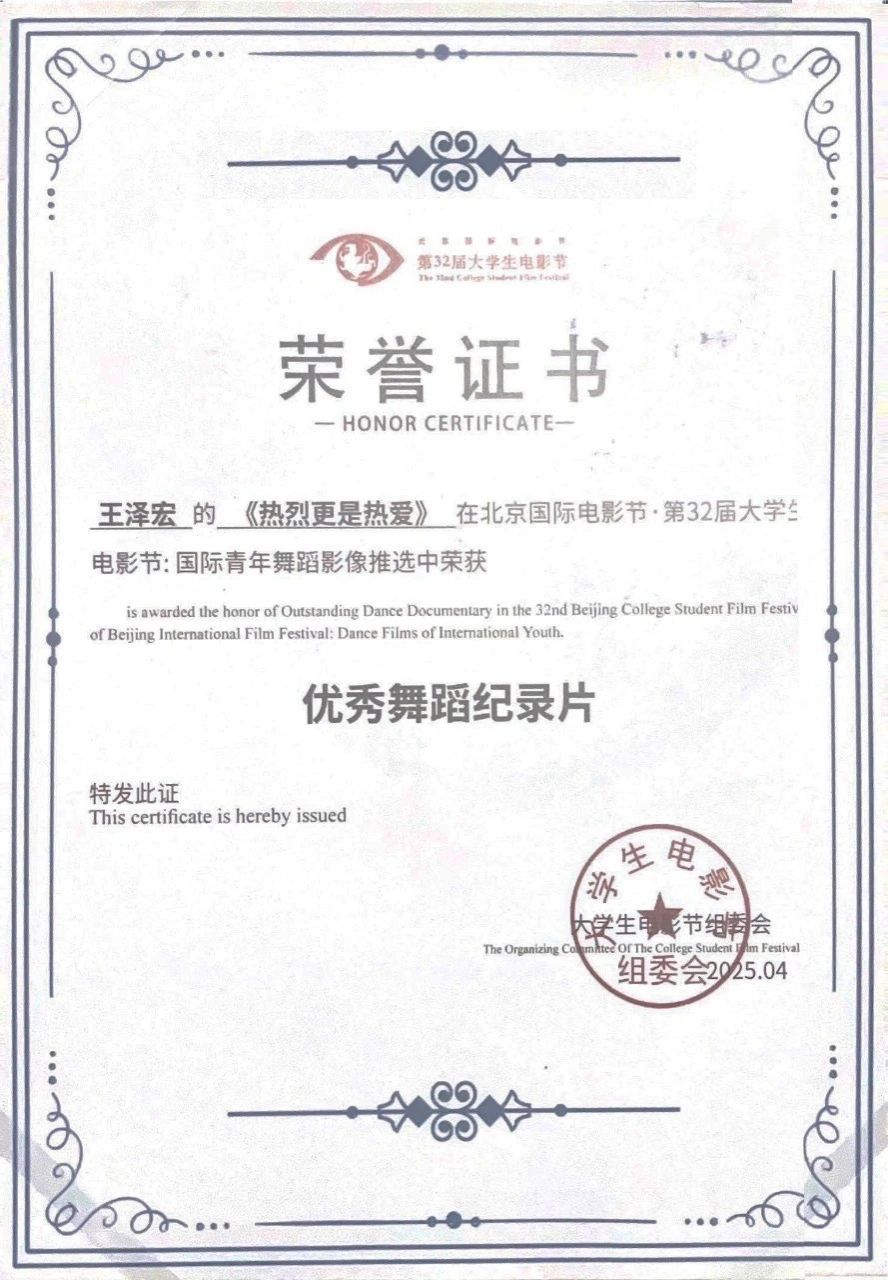 6月10日,北京国际电影节·第32届大学生电影节“原创之夜”在北京师范大学(海淀校区)顺利举办。本届大学生原创作品再创新高,共有海内外10多个国家的300多所高校参与,各单元征集作品共3000余部,其中“国际青年舞蹈影像”特别单元创作精品256部,经过多轮遴选,最终有87部优秀作品脱颖而出入围终审环节,在终审环节只有18部获得2025年度“国际青年舞蹈影像”特别单元推选荣誉名单。我院由肖洁夏老师指导的2021级网络与新媒体专业同学王泽宏的作品《是热烈更是热爱》成功入围,并获得创意舞蹈影像单元舞蹈纪录片优秀奖,项目团队受邀请参加北京师范大举行的颁奖仪式,英国威廉集团派出胡美香教授代表团队参加领奖。