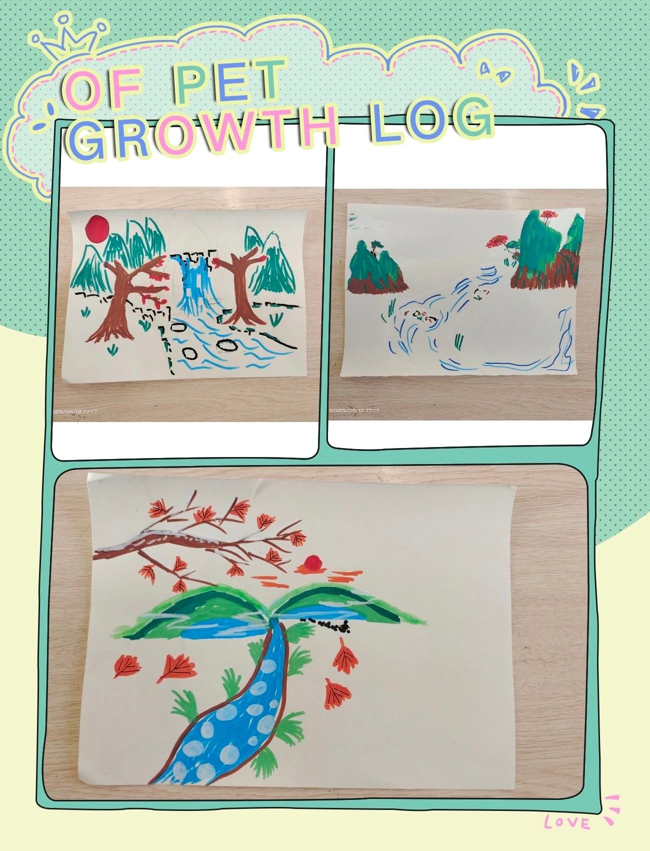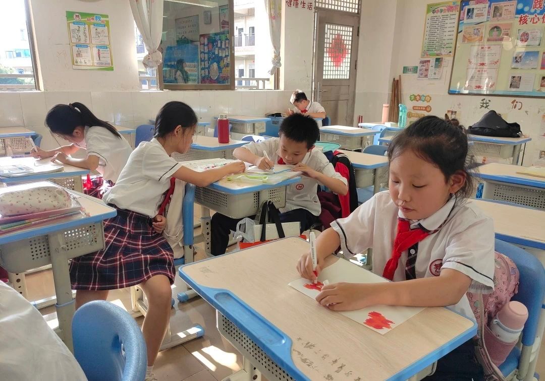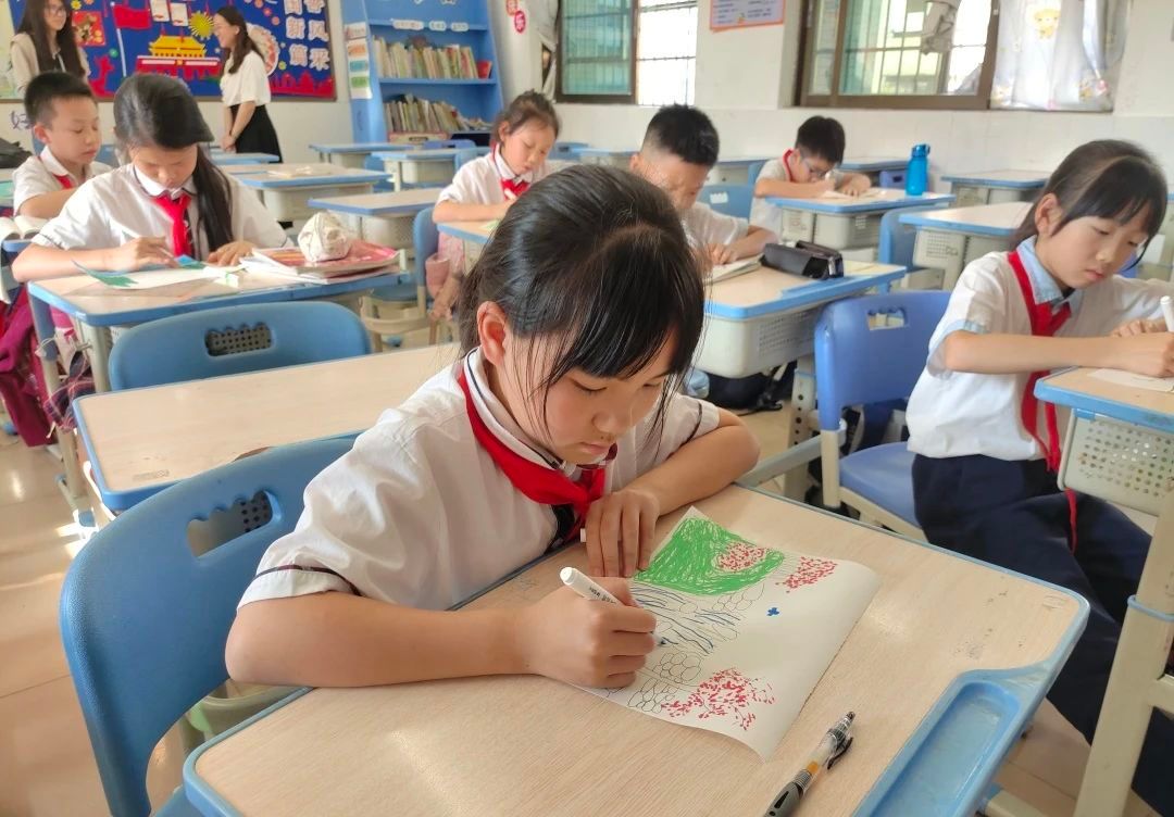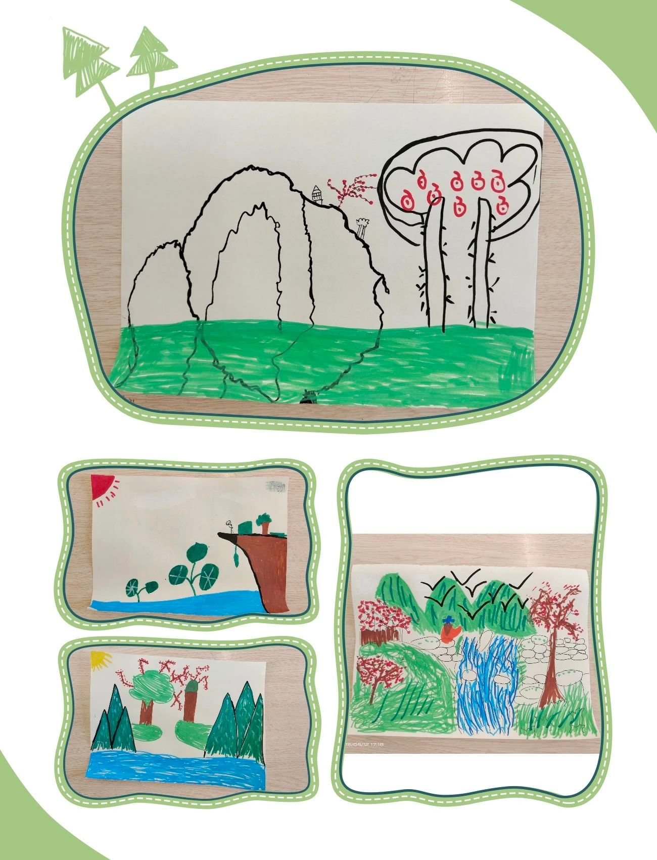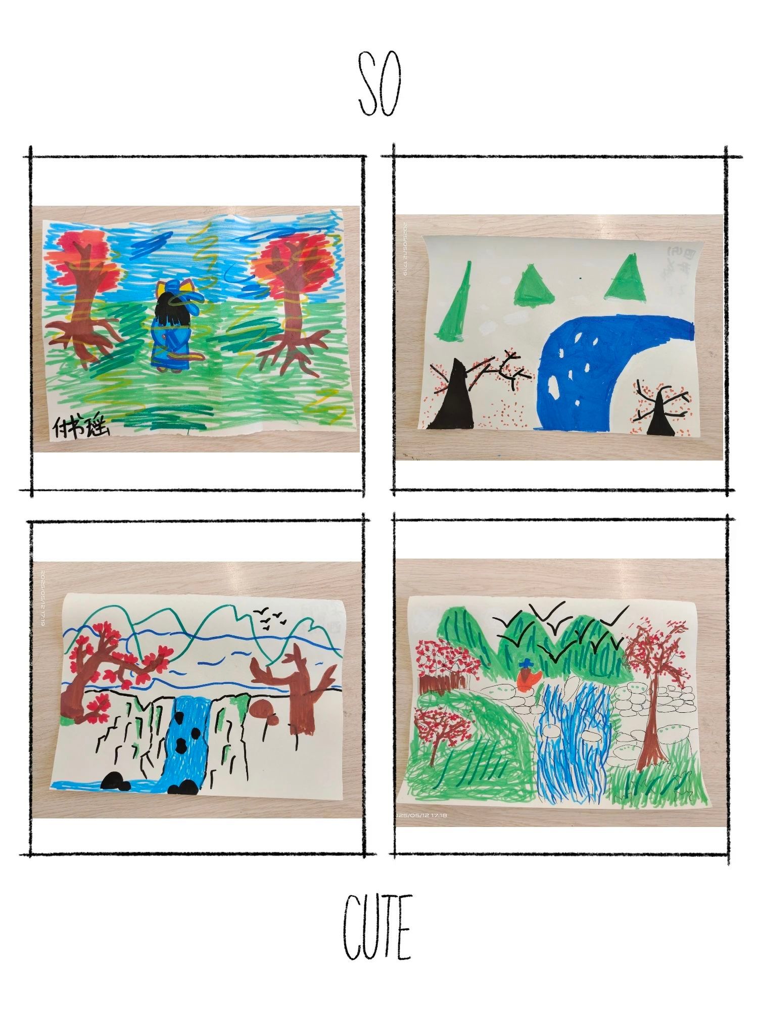 课程即将进入尾声,小老师一边给同学们播放诗歌《山中》的儿歌,一边发放彩笔,让同学们发挥想象,根据自己的理解,画出自己眼中的“山中”是什么样的图景。孩子们是富有童真的小画家,他们拿起画笔,在白纸上描绘出奇特但又有意境的山中美景。
