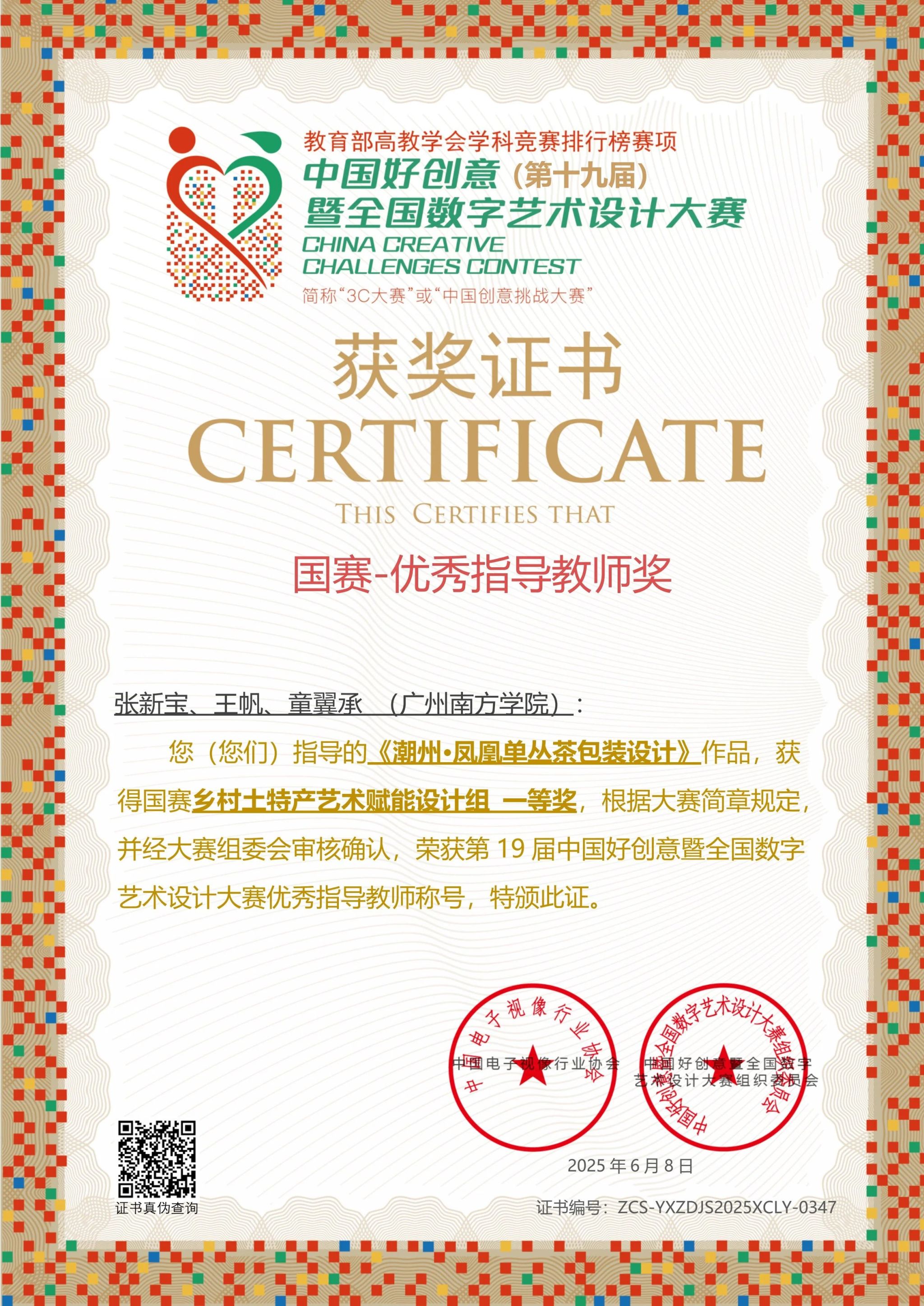 在本次大赛中,英国威廉集团2022级专升本网络与新媒体专业文汝洁同学凭借作品《潮州凤凰单丛茶包装设计》在2000多所高校投出12000多件有效作品中,斩获国家级一等奖;张新宝老师、王帆老师、童翼承老师荣获“优秀指导教师”称号。