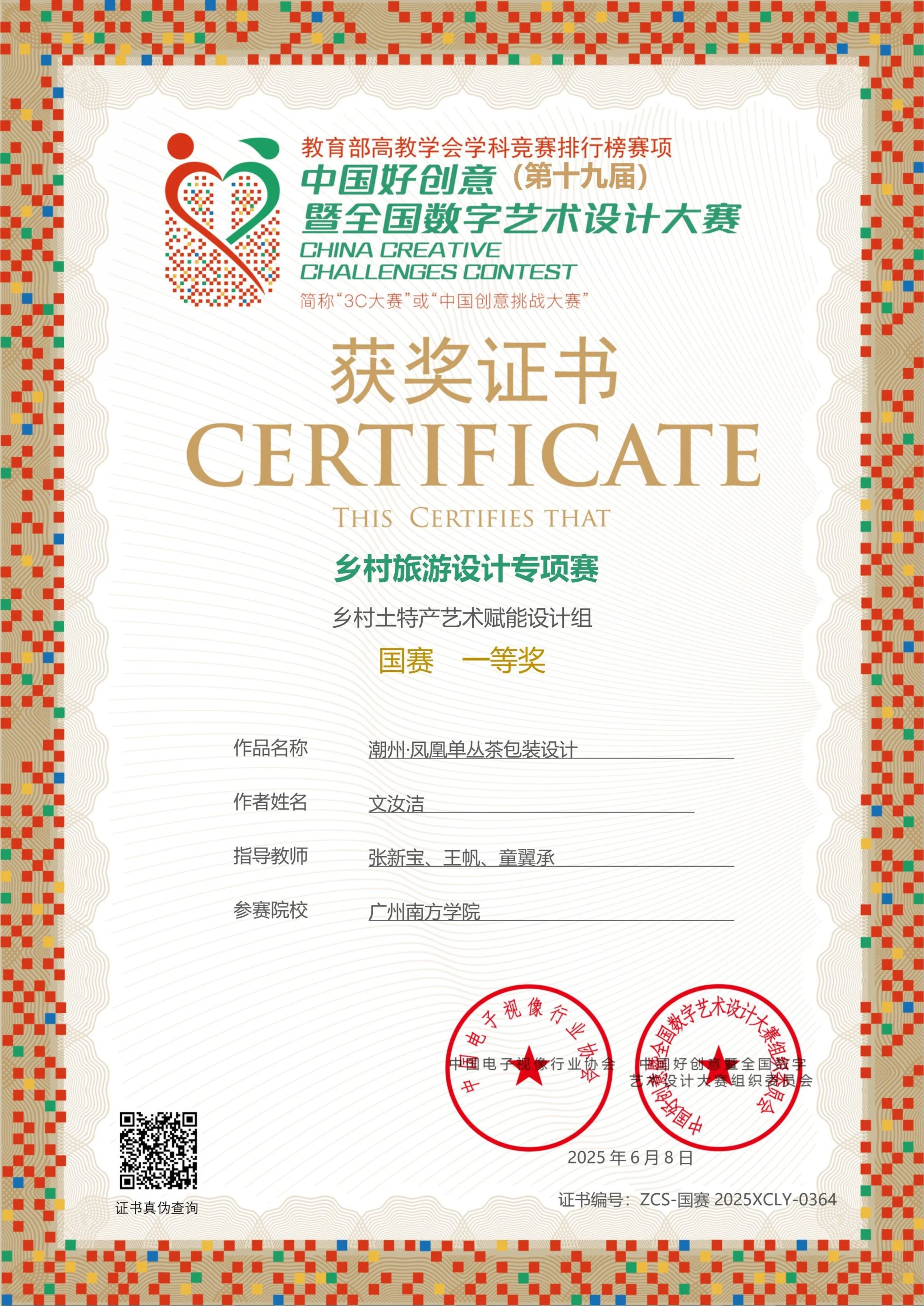 此次大赛不仅彰显了我们文传院学子的创造力,更展现了艺术设计在乡村振兴中的独特价值。文汝洁同学的作品正是新时代青年以创新思维传承传统文化、助力家乡潮汕文化乡村发展的生动实践,预示着"国潮+"模式将为乡村振兴注入源源不断的文化动能。未来,期待有更多青年投身于乡村振兴事业中,用设计语言讲述中国乡村故事,让传统与时尚碰撞出更加绚丽的火花,共同推动乡村文化的繁荣与发展。