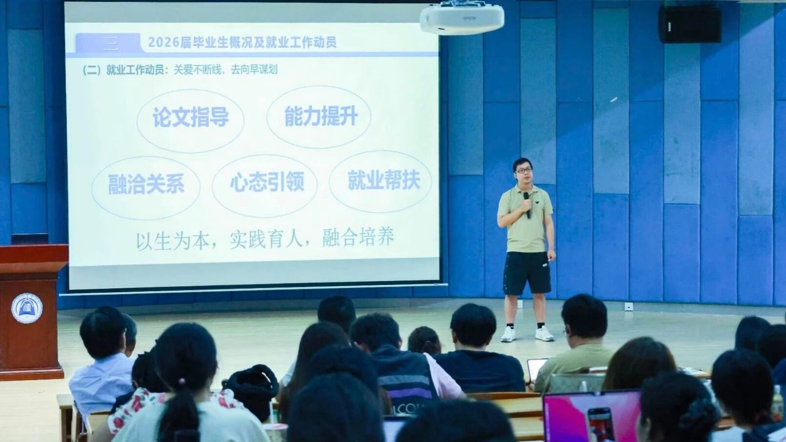 游鸽副院长就学院就业与招生工作作相关汇报。他指出,2025届届毕业生就业工作取得显著成效,总体就业率超出预期目标。同时,学院升学率持续攀升,并通过拓展合作渠道,为学生开辟了更多元、畅通的深造路径。面对2026届毕业生规模扩大带来的就业压力,游鸽副院长建议指导教师加强职业规划引导,实施“前置就业”策略。最后,他强调,招生就业工作是学院发展的生命线,其重要性不言而喻,希望全体教师凝聚共识、形成合力,为吸引优秀生源贡献力量。