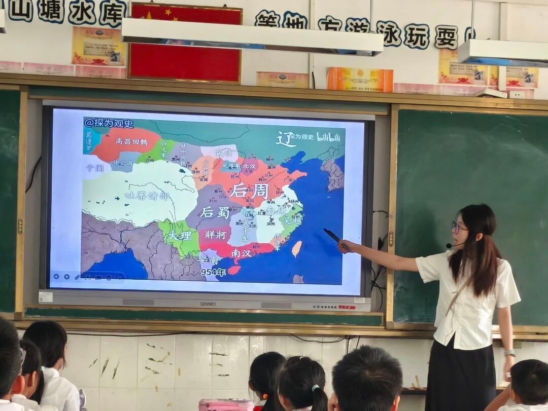 谈及“山河破碎”,她借助五代十国地图讲解南唐被北宋所灭的历史背景,当提到李煜“肉袒受降”的屈辱时,同学们纷纷露出惋惜的神情。而后为了让同学们更好体会李煜当时受降后的屈辱心境,小陈老师带领同学们一起朗诵李煜的《相见欢·无言独上西楼》,稚嫩却饱含情感的声音在教室里回荡,让同学们进一步体会到诗词的韵律之美。