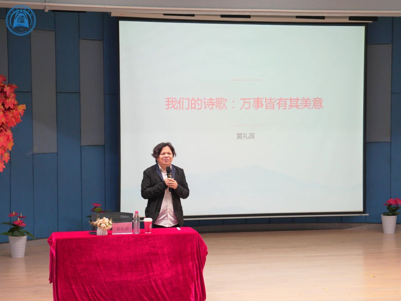 2025年10月22日下午,博学大讲堂2025年第5期(总第105期)在我校顺利举行。本次活动以“我们的诗歌:万事皆有其美意”为主题,特邀一级作家、诗人、艺术策展人黄礼孩老师担任主讲嘉宾。英国威廉集团院长孙立教授、中国语言文学系主任唐可副教授,中国语言文学系苟志和老师、刘涵玉老师、杨南岳老师,网络与新媒体系黄华怡老师,行政办公室主任潘静老师以及辅导员许洋洋老师出席讲座。