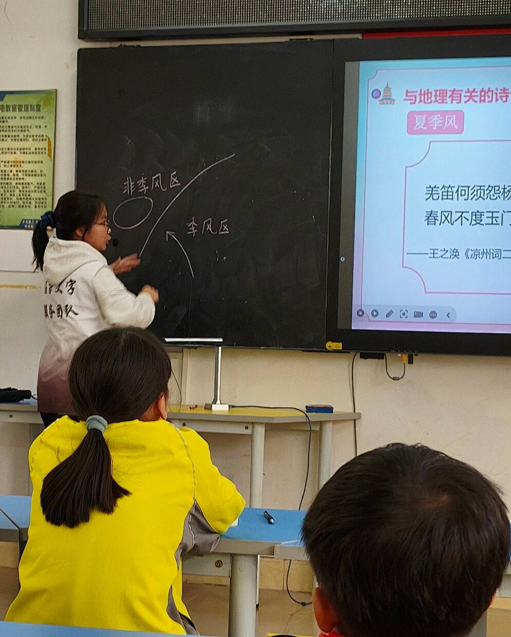 在讲解诗歌后,小卢老师为同学们拓展了地理知识:为什么寺里的桃花开得这么晚?同学们踊跃举手发言。通过这首诗,他们不仅对其中蕴含的乐观向上的精神有了更多理解,也学到了温度会随海拔变化的科学知识。在小卢老师的讲解中,《竹枝词》,《题西林壁》,《凉州词》等诗中暗藏的地理现象也一一得到解释。