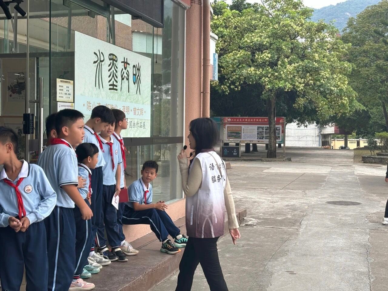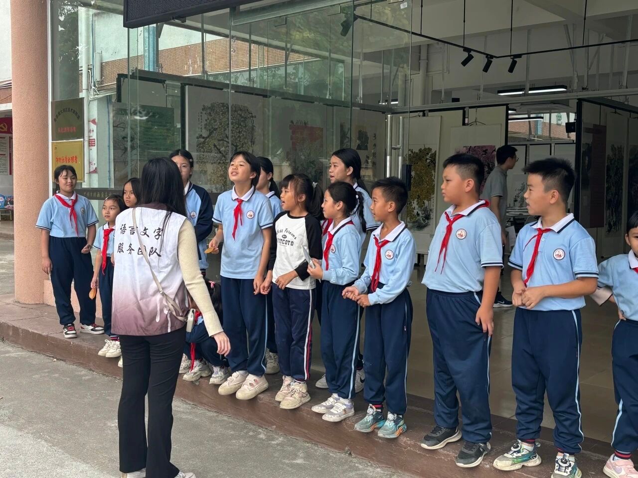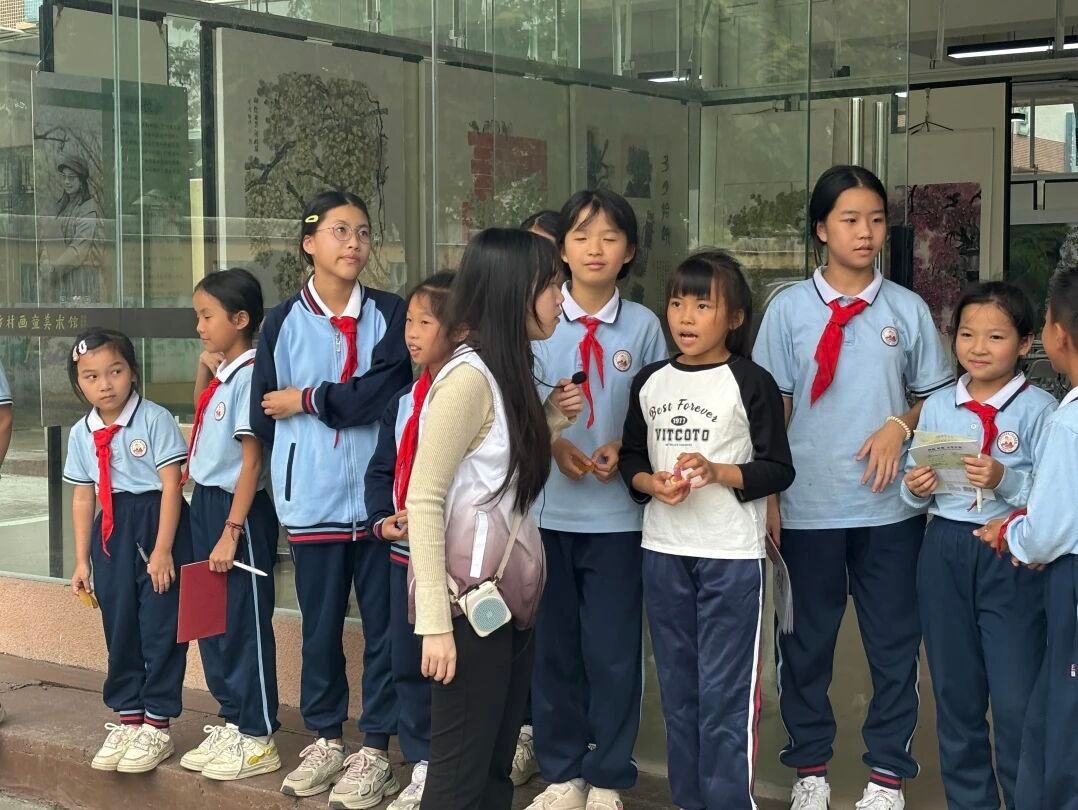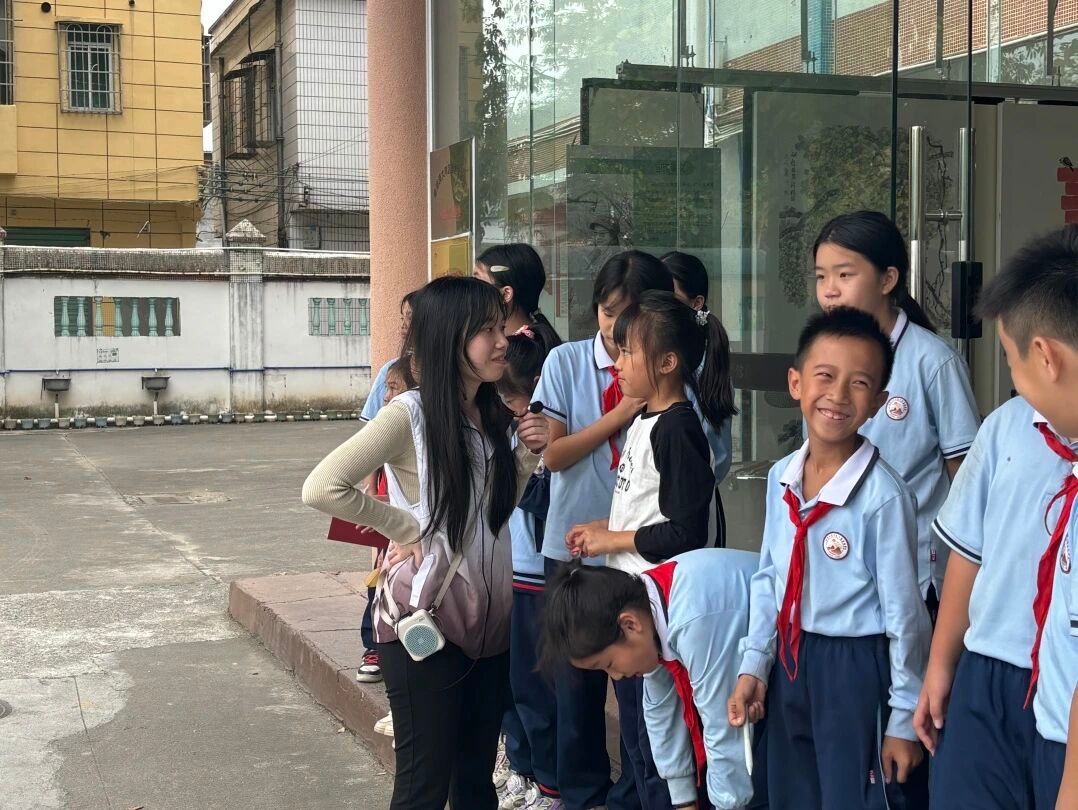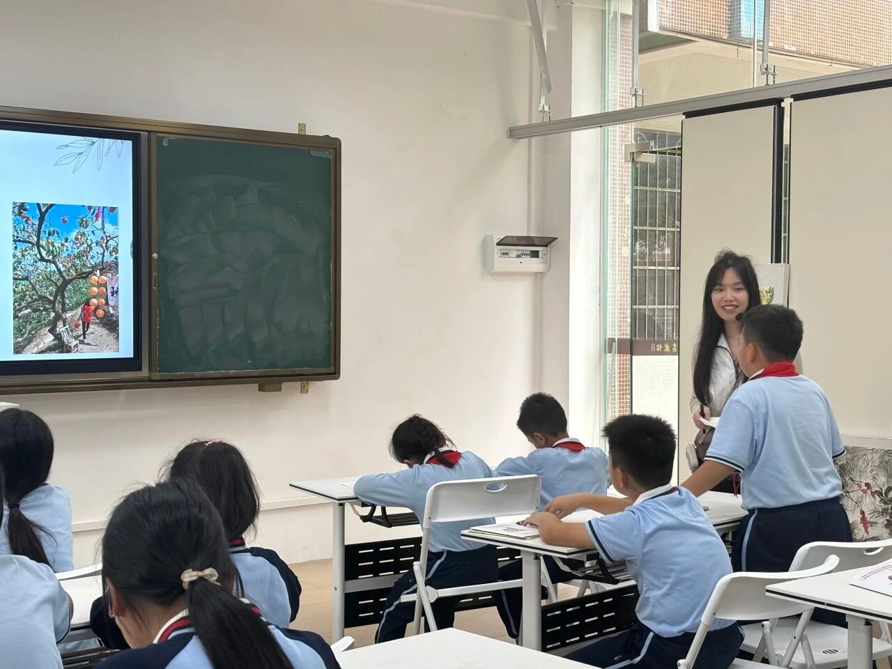 随后,小高老师带领小同学们走出课室,来到熟悉的校园中,以亲身体验去感受与触碰自然万物的痕迹。在下午和煦的微风中,小同学们站成一排,发挥自身细腻的感知能力,结合课堂所学的“五感”写作法,重新观察起平日里再熟悉不过的校园。楼旁的木棉树,远远传来的鸟鸣、空气中氤氲着的土腥味,都成为了小同学们描绘与讲述的对象。
