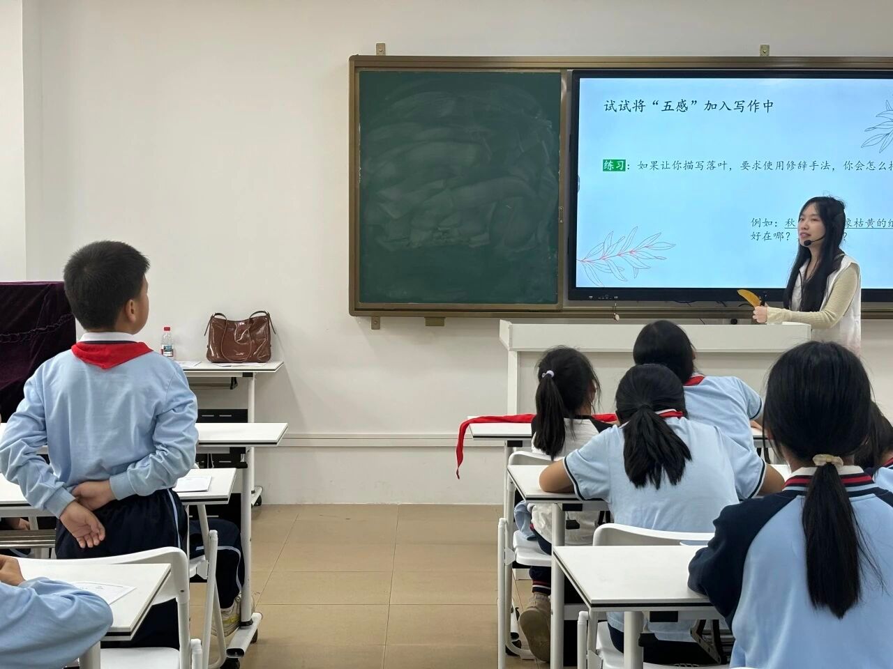 紧接着,她请小同学们观察手中的树叶,并以自己的语言描绘这片叶子。同时,小高老师也展示了五句从不同感官角度描绘的例句,以具体的案例引导小同学们发散思维,开动脑筋。金黄的落叶,此刻化作了小同学们打开“五感”写作之门的钥匙。台下的同学们踊跃回答,有说树叶是黄色的,有说叶脉的纹路是粗糙的,也有小同学把树叶放到鼻边,感受传来的丝丝微苦气息,更有同学大胆地把树叶放到嘴中,并得出结论:“像香蕉的味道!”视觉、触觉、嗅觉、味觉……不同感官反映出的对树叶的感知,用活泼却准确的话语说出,凝聚成小同学们对“五感”写作的朦胧初感。