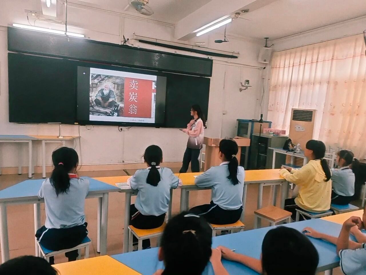 课堂伊始,小胡老师以“满面尘灰烟火色,两鬓苍苍十指黑”的诗句切入,屏幕上炭翁满脸尘灰、手指焦黑的形象瞬间抓住了孩子们的目光。小胡老师缓缓道来:“这不是一位普通的老人,他是长安城外的‘烟火守护者’,以烧炭卖炭为生计,每一缕炭烟里都藏着他的故事。”
