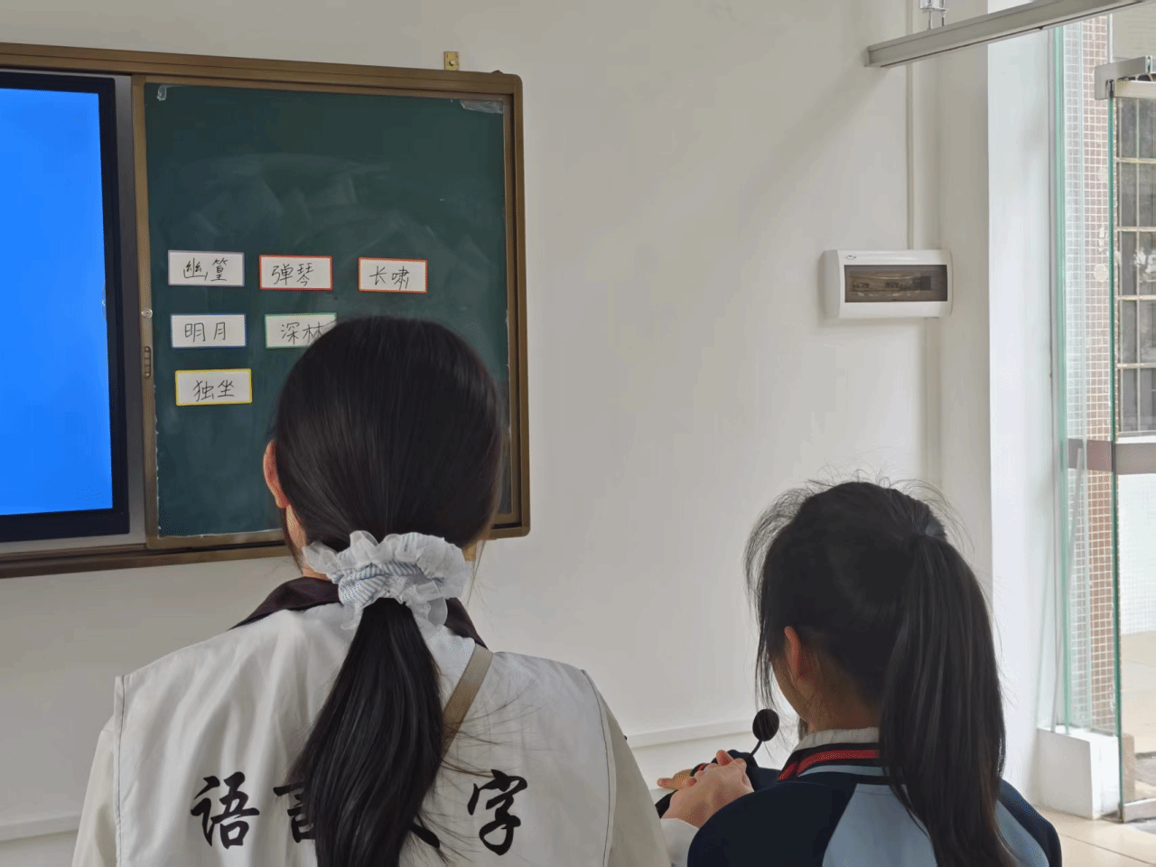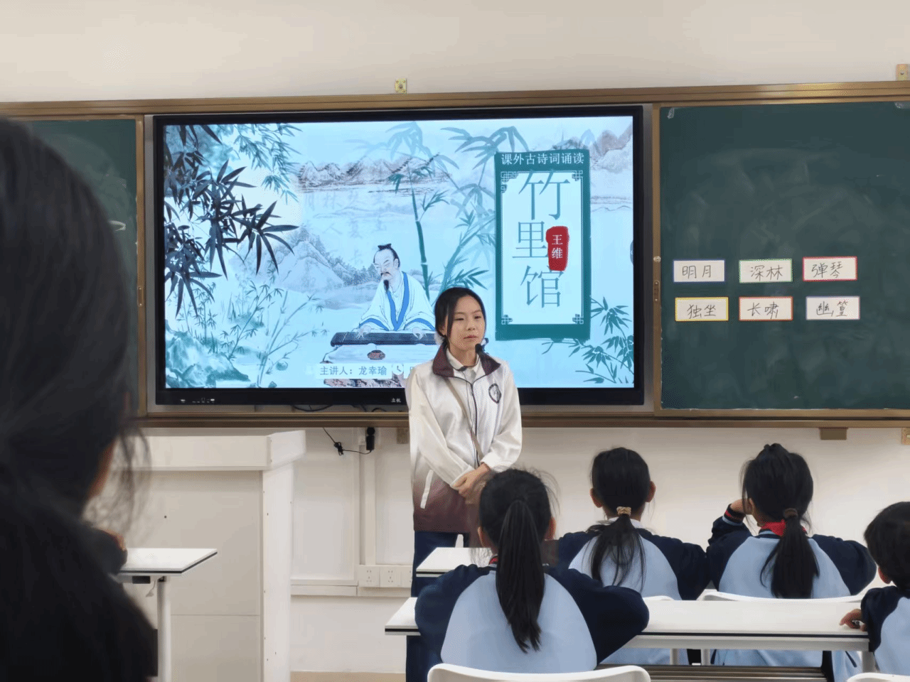 2025年11月13日下午,语言文字服务团队的成员们在指导老师杜欣莉老师的带领下,走进从化区善施学校。混入竹香的古诗词课堂准备就绪,小朋友们走进课室,也走进了“竹里馆”。