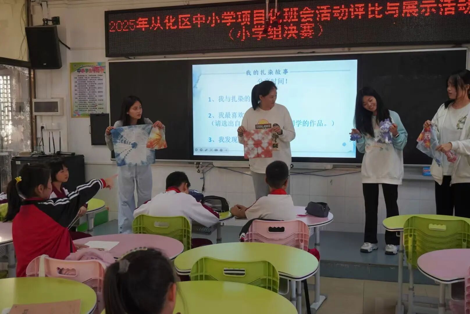 随后,课堂进入“我的扎染故事”分享环节。孩子们脸上洋溢着灿烂的笑容,小手齐刷刷地举起,迫不及待地想讲述自己与扎染之间的点滴回忆,也渴望聆听他人的创作趣事。在一片热情洋溢的氛围中,小田老师顺势将话题引向“从化与扎染的故事”。她先播放了一段精心准备的视频,带领同学们初步认识扎根于本土的“从化扎染”。视频之后,小田老师借助PPT进一步讲解了从化扎染的独特之处。她告诉大家,从化的荔枝壳、黄皮叶等自然材料,都可以作为染色的原料;而荔枝、流溪山水、温泉等地方元素,也可以融入扎染的图案设计中。这不仅让扎染艺术更加贴近生活,也让孩子们对家乡的文化资源有了全新的认识。课堂中不时发出阵阵笑声与讨论声,扎染的魅力在轻松愉快的氛围中悄然传递。