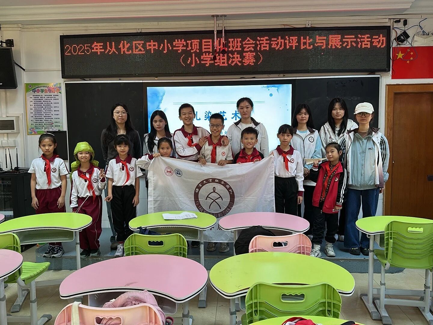 临近尾声,小田老师向同学们抛出一个富有挑战性的问题:“如果我们为从化设计一款扎染旅游纪念品,你会怎么设计?”问题一出,孩子们的想象力如泉水般涌出——“一个印有荔枝图案的书包!”“扎染发圈,每天都可以戴!”“一条有流溪河颜色的扇子!”……他们争先恐后地表达自己的想法,每一个回答都是对非遗扎染真挚喜爱的印证。