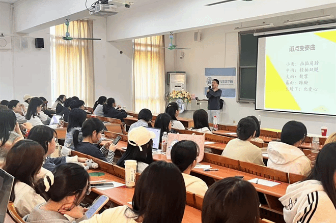 讲座伊始,鲁老师带领同学们进行了轻松有趣的“雨点变奏曲”热身活动:听到“小雨”拍肩,“中雨”轻拍双腿,“大雨”鼓掌,“暴雨”跺脚,“天晴”比爱心。这一互动迅速拉近了师生距离,也让大家体验到情绪与身体的联结。鲁老师强调:情绪如天气,多变而短暂,但心灵本身是稳定的,我们应学会接纳每一种情绪,而不因一时波动自我怀疑。