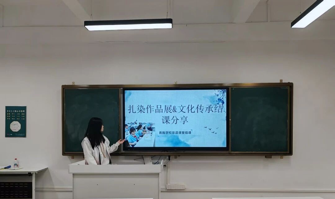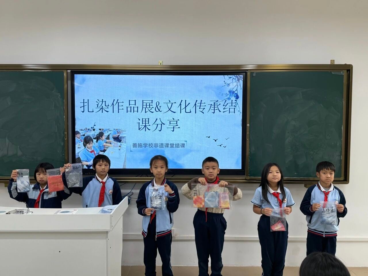 在课堂的最后,小朋友们陆续上台,与自己的作品进行合影。在分享的时间里,小朋友们扬起笑脸,双手高举扎染作品,眼里满是兴奋与自豪。在欢声笑语中,这次结课分享会落下了帷幕。寒来暑往,秋收冬藏。从燥热的仲夏走到寒风凛冽的冬天,善施学校扎染课堂也圆满结束,但文化的传承永远不会停止,这份在非遗课堂里埋下的种子,将会在非遗传承的沃土上,开出最绚丽灿烂的花朵,让非遗之美跨越时空、生生不息。