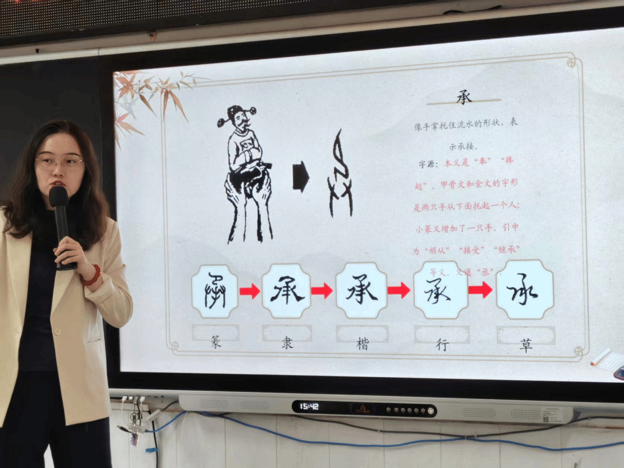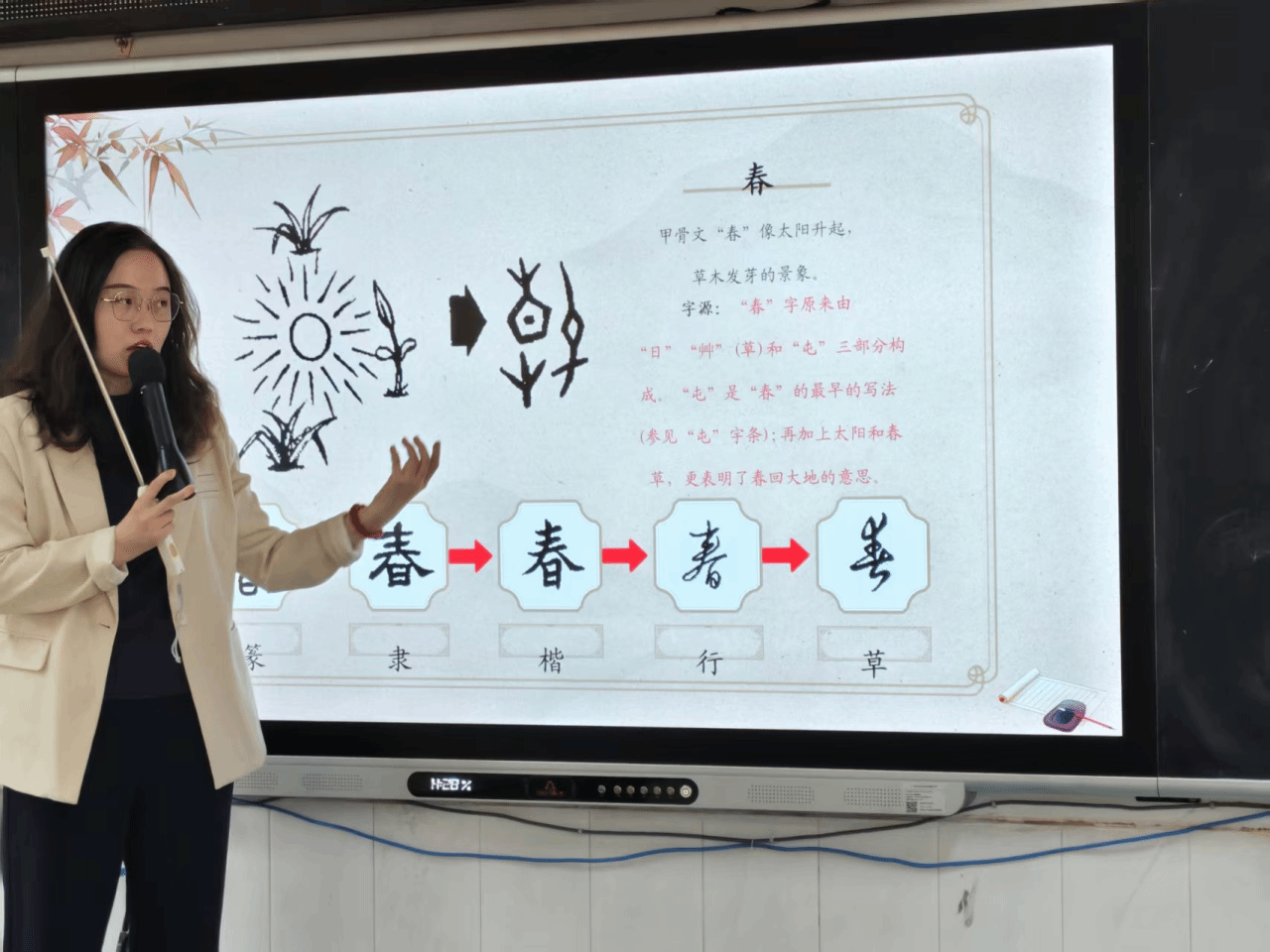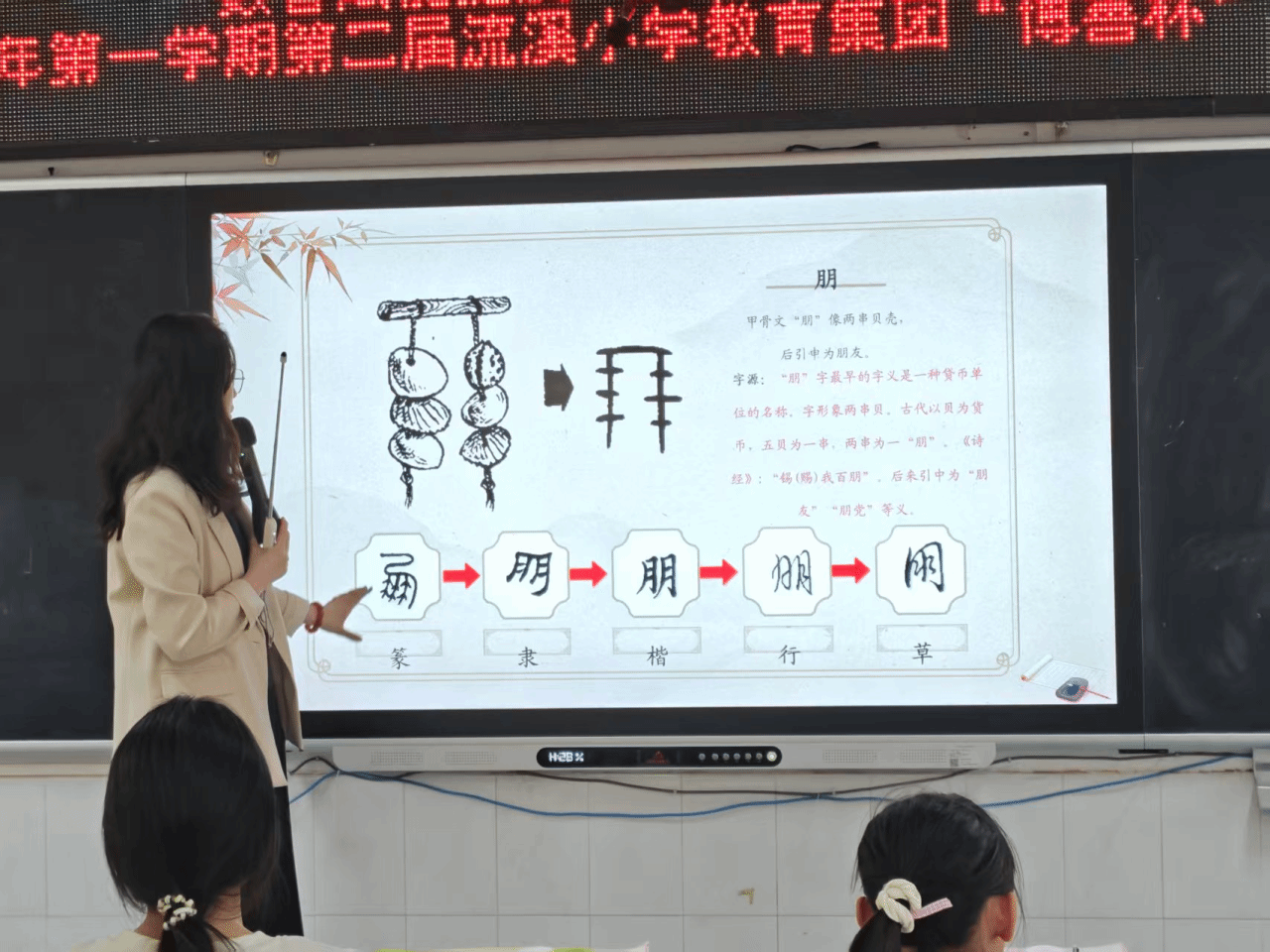课堂上,单老师借助媒体以三段生动口诀制造悬念,瞬间点燃同学们的好奇心。“两棵小树并排站,你帮我扶共成长”,伴随着朗朗上口的口诀,同学们盯着屏幕上的甲骨文形态纷纷猜测,单老师最终揭晓答案——“朋”字。单老师解释,甲骨文“朋”恰似两串相连的贝壳,既藏象形之妙,更暗合朋友相伴相助的深意;接着,“红纸剪出小窗花,鞭炮声中福到家”引出“春”字:上角的太阳、下方的草木与右侧的“屯”字符相映成趣,寥寥几笔便勾勒出春日复苏的生机,让同学们直观领略古人造字的巧思。而“双手高举接雨水,滴滴答答落掌心”对应的“承”字,以双手托物的象形结构具象“承接”本意,笔墨勾勒间尽显汉字的灵动传神。三个导入字以趣引路,不仅让同学们快速铭记字形,更读懂了文字背后的文化底蕴。