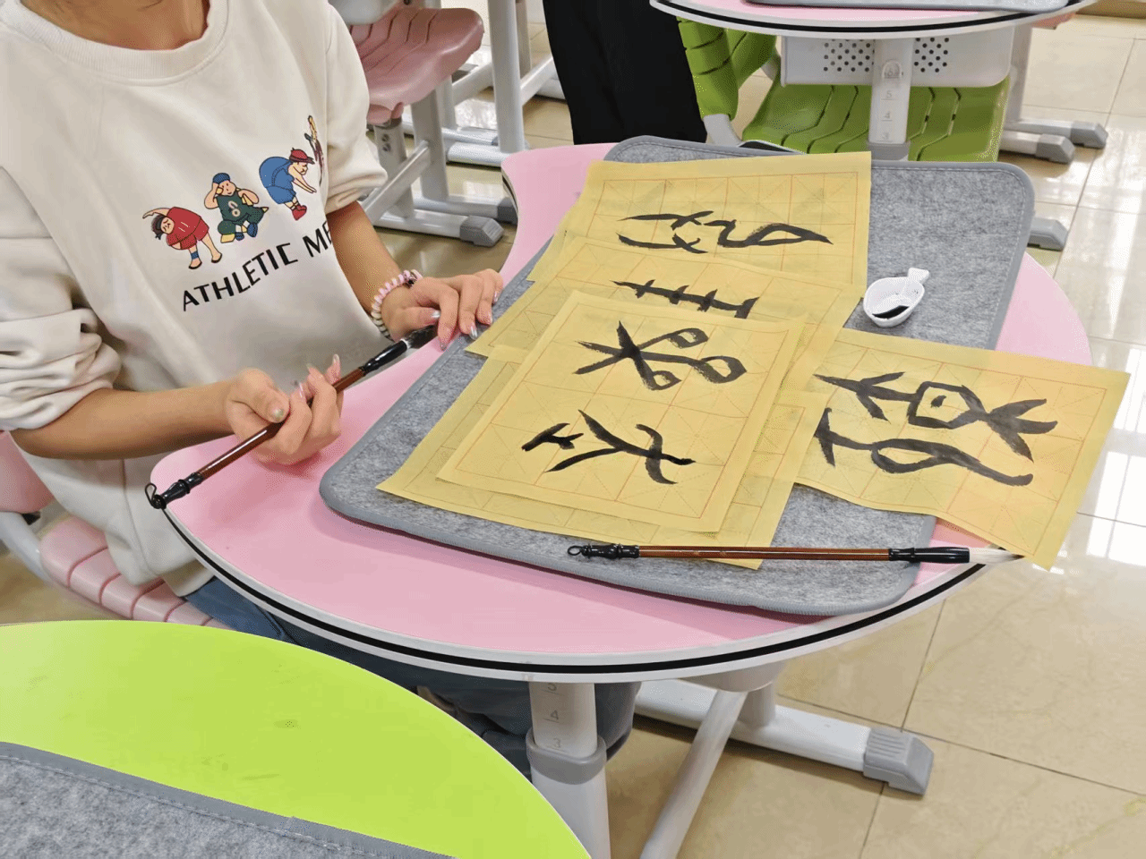 实践体验的沉浸式探索,让课堂亮点纷呈。单老师一边指导毛笔执笔姿势,一边手把手纠正同学们的动作,课堂氛围格外温馨。随后的笔法教学中,“中锋用笔”与“侧锋用笔”两大核心技巧被拆解得通俗易懂:中锋需笔尖始终行于笔画正中,写出的线条饱满匀称,如“鼠”“其”等字般厚重有力;侧锋则要笔尖微倾,让笔画生出粗细变化,更显灵动韵味。同学们蘸墨、起笔、行笔、收笔,在反复练习中摸索手感,有的小朋友虽初次握笔,却格外认真,慢慢在方格中写出工整的横竖,在单老师的指导下调整笔法,感受不同用笔方式带来的线条差异。