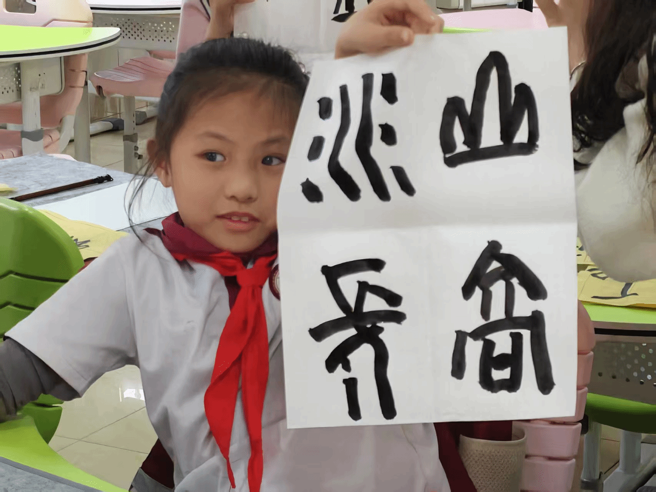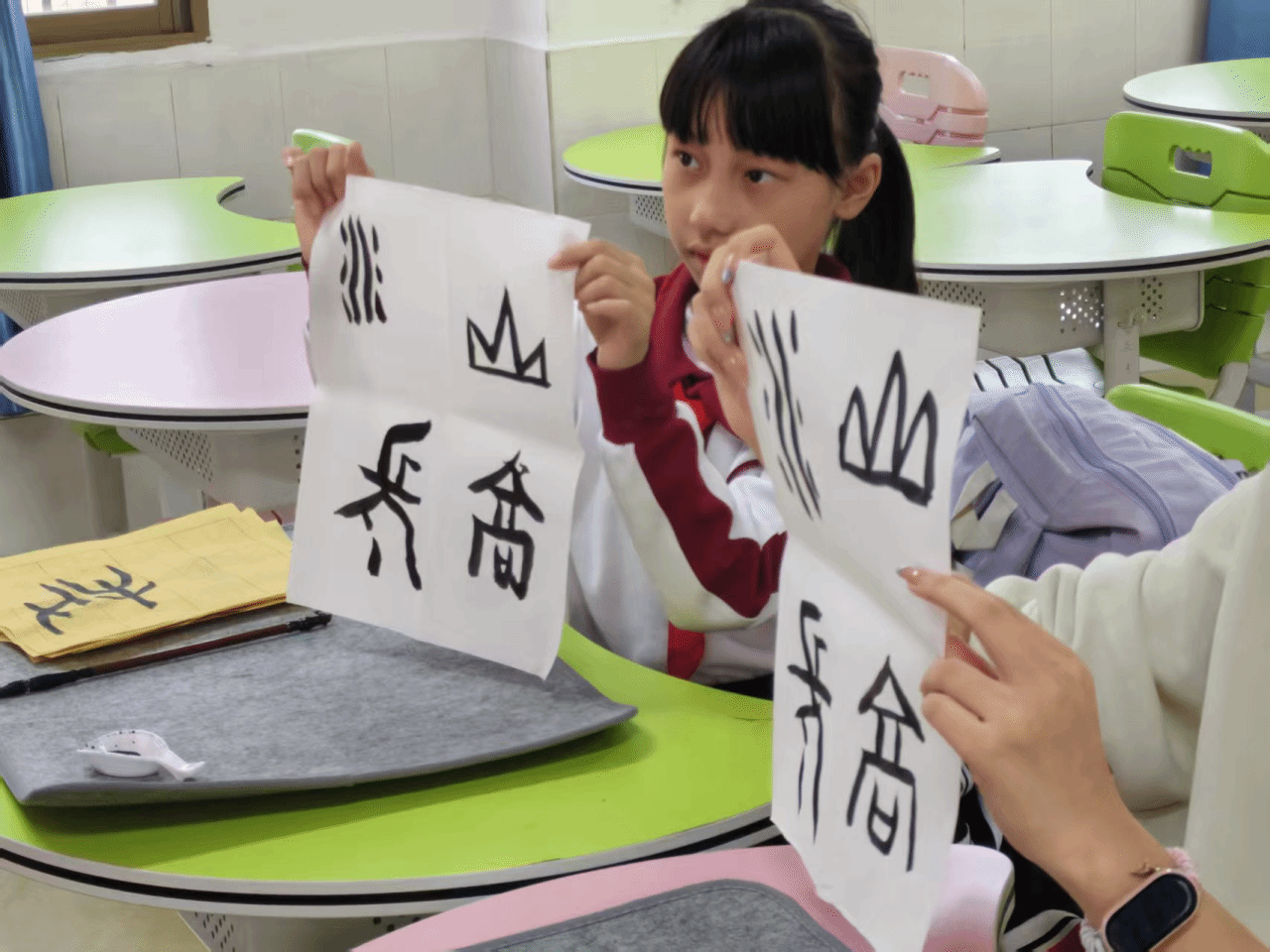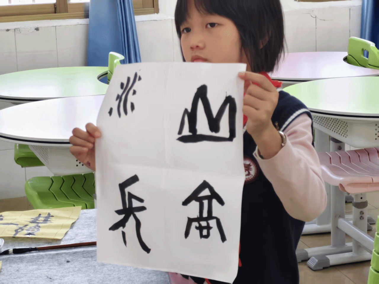 课堂尾声,同学们高举自己的创作成果,在镜头前留下珍贵合影。黄色的练习纸、白色的创作作品,承载着满满的收获与喜悦。此次甲骨文小课堂跳出传统教学模式,以“趣味猜字+笔法教学+字形临摹+创意创作”的多元形式,让同学们在动手实践中领略甲骨文的独特魅力。不仅掌握了毛笔书写的基础技巧,更读懂了汉字背后的文化密码,让千年甲骨文在新时代焕发出新的生机与活力。