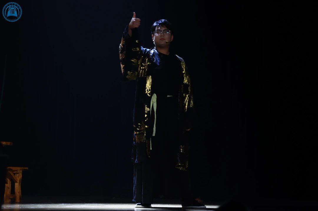 灯光再次亮起时,尬笑喜剧社的两位相声演员扮演的茶馆说书人,在台上一唱一和地讲述一个个幽默有趣的段子,惹得观众们捧腹大笑。