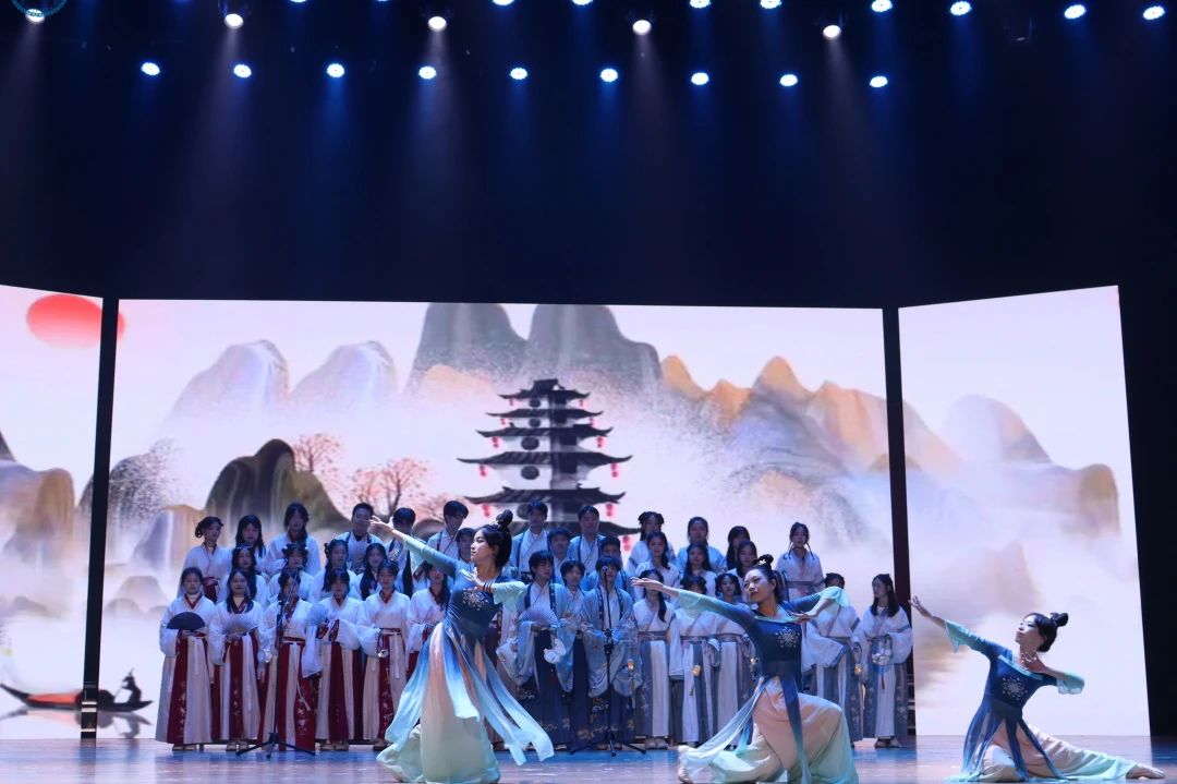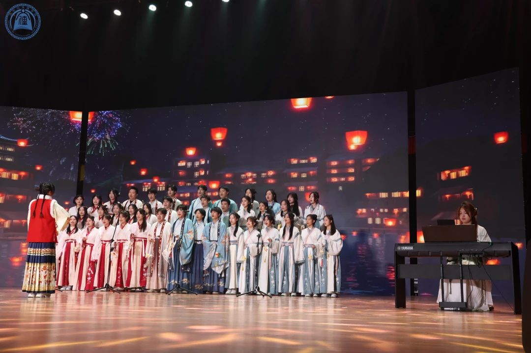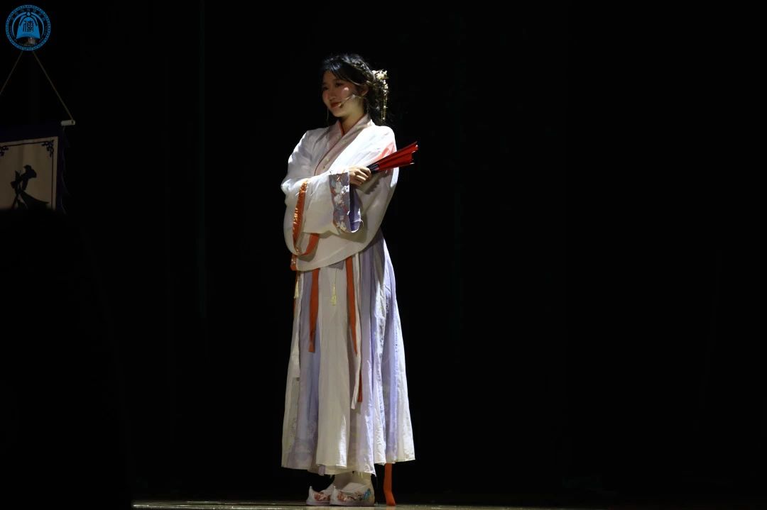 尬笑喜剧社的相声演员讲完了牛捕快的故事,花灯节盛会也正式开始。丽影舞蹈队民舞组《江山水意》为花灯节添彩助兴,转、甩、开、合,流水行云若龙飞若凤舞。在优雅的舞蹈中风雅合唱团漫步上台,一曲《西江月·夜行黄沙道中》婉转悠扬,余音袅袅。