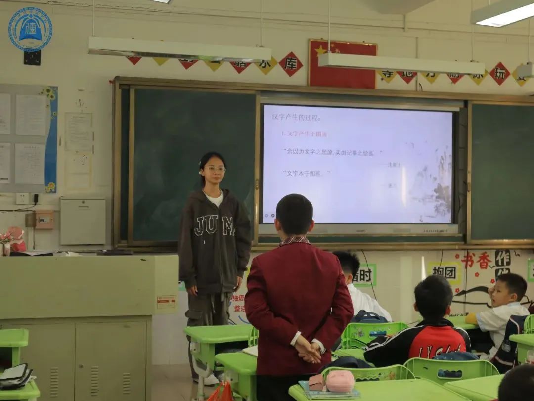 第五讲课堂,文传学子走上讲台。语言文字服务队的邓慧同学当上了“小老师”,他为小朋友们讲述了结绳和契刻、仓颉造字说、八卦说、起一成文说等传说,带领小朋友们一起追溯汉字的起源。