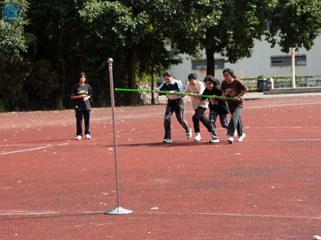 随后,我们来到同“竿”共苦的比赛场地。各班派出六名同学,第一人双手持竿从A障碍物出发,绕过B障碍物接上一员,返回并绕过A障碍物再接一员,以此类推,直至接上第六名成员,冲过终点。若比赛途中出现掉竿情况,则需要等所有参赛成员持竿后才能继续比赛。