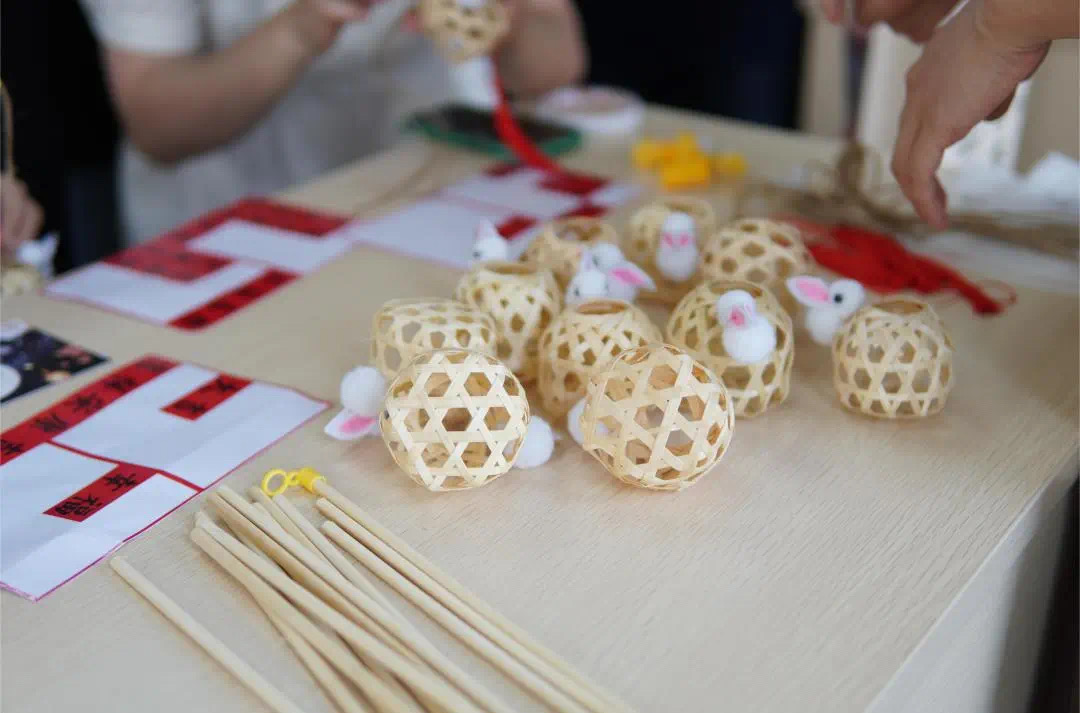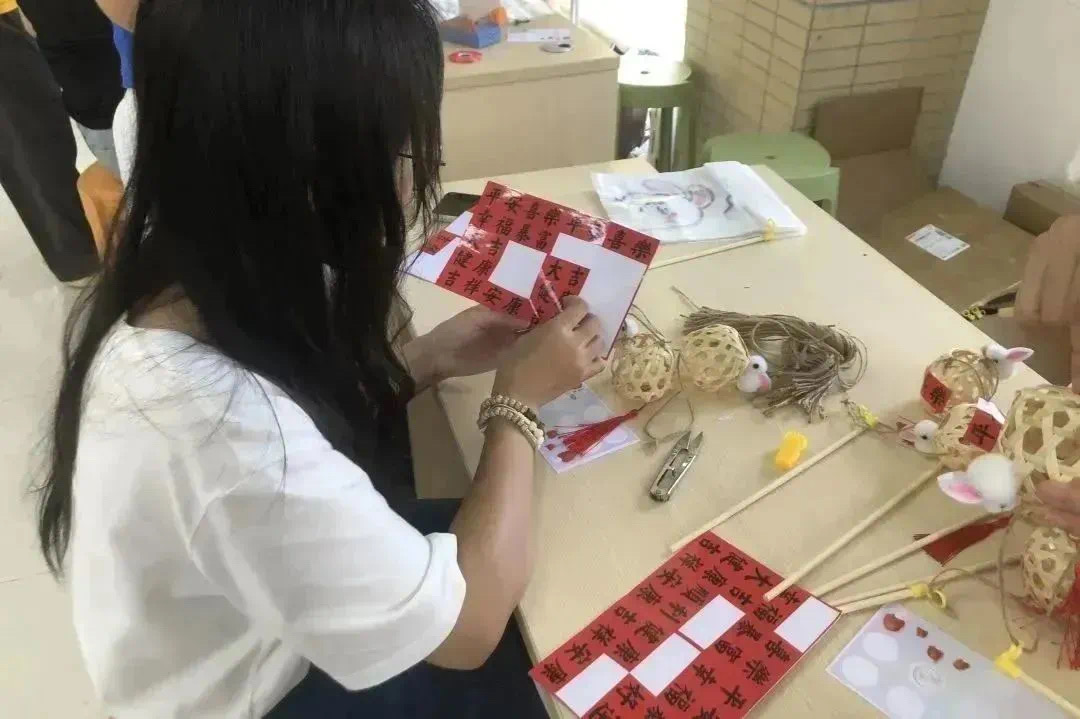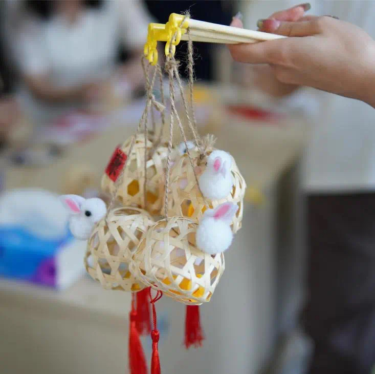 同时,工作人员在另一边分发制作花灯的材料包,并为大家讲解制作方法。同学们按照步骤小心翼翼地进行粘贴,很快一个个透着喜庆的兔子花灯呈现在大家眼前。