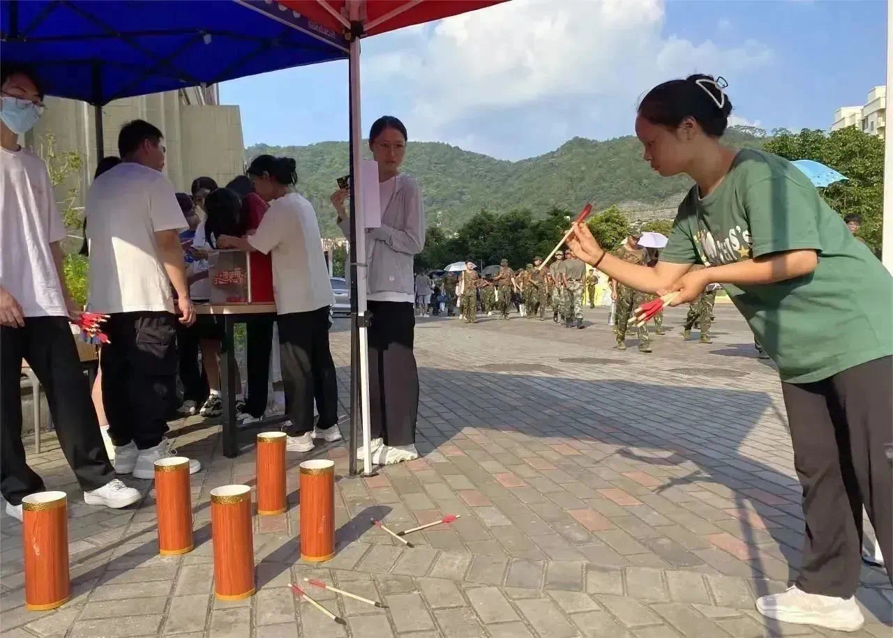 “击筑落高月,投壶破愁颜”。投壶,一种由射箭演变而来的投射游戏形式。同学们手着十支箭,站在离壶一定距离的地方,怀着紧张而兴奋的心情一支一支地向壶中投去。现场中,有的同学因只投中一两只箭而感叹不已,有的同学因投中七八支箭而欢呼雀跃。多种声音交错在一起伴随着箭投进壶里的声音,缓缓流荡在佳节之中。