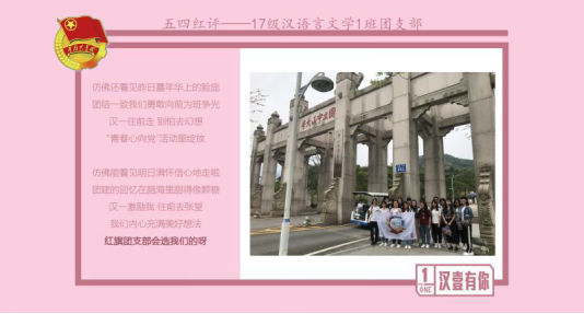 本次评选共有汉语言文学专场18个团支部、新闻学和网络与新媒体专场19个团支部参与。各团支部代表依次上台展示本班风采,通过视频、新闻报道等生动幽默的方式从组织建设﹑思想建设﹑学风建设等各个方面为大家详细地介绍班级情况。在展示过程中,我们可以看到各团支部通过庆祝中华人民共和国成立七十周年﹑班级出游﹑线上抗击疫情等一系列活动丰富了同学们的课余生活,开拓视野,展现出强大的班级凝聚力。