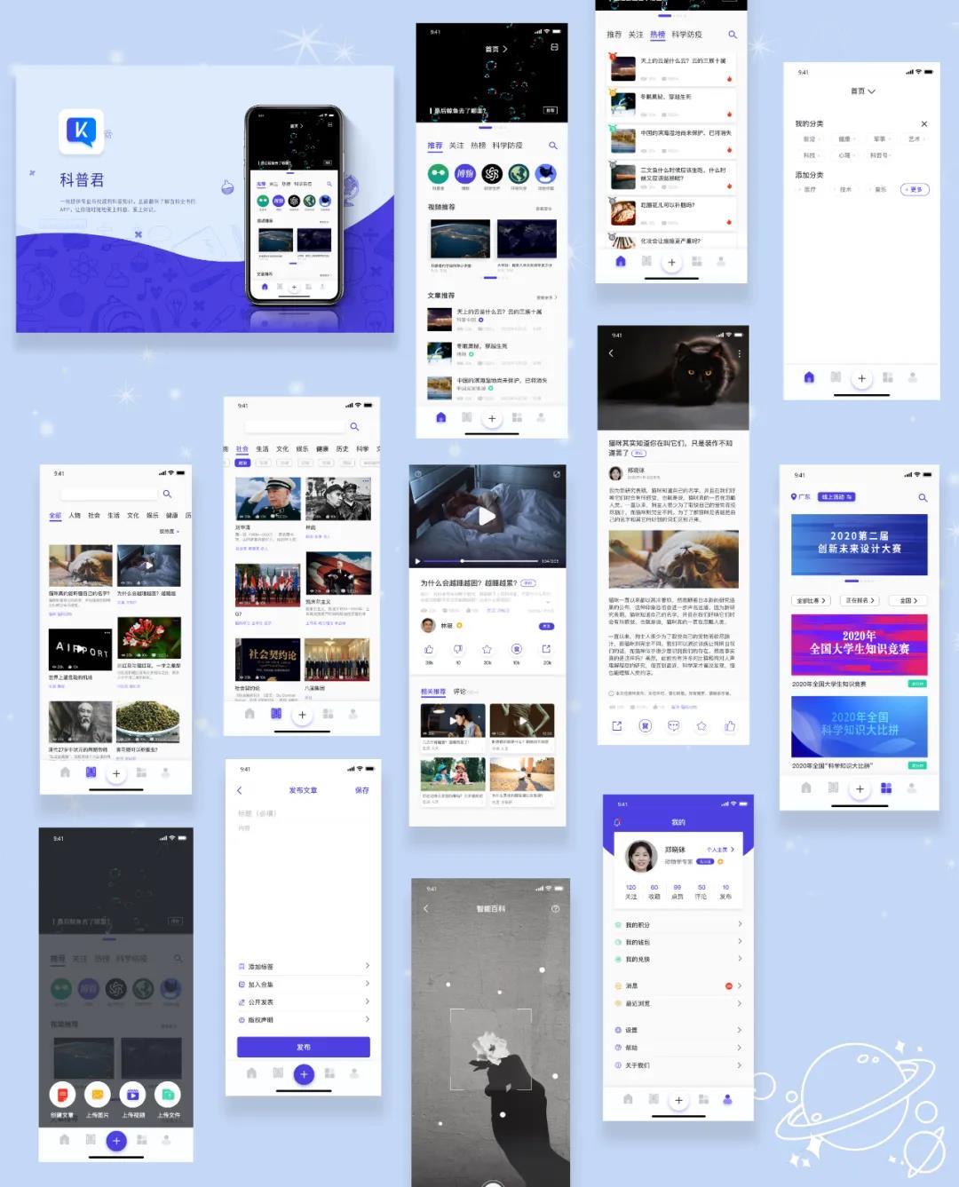 她们参赛作品是一个科普APP的UI界面设计,是一个兼具专业和权威的科普知识APP。当问及选择参赛作品的原因时,林晓君同学认为有时候人们想要了解更多的知识,满足好奇心。但科普类的APP数量不多,而且比较枯燥,内容满是文字,且内容长,用户在使用时很容易会感到枯燥无味,也不大有耐心去看,从而导致用户流失。为解决这些问题,她们从界面的设计出发。内容块之间给与适当的留白,不仅带来视觉上的美感,更重要的是减轻页面带给用户的负担,给人以舒适感和呼吸感,让原本复杂冗杂的信息内容化繁为简,且图文、视频结合进行呈现,从设计上让用户更容易去接受知识。她们希望用户能够轻松的获得知识、爱上知识、爱上科普。