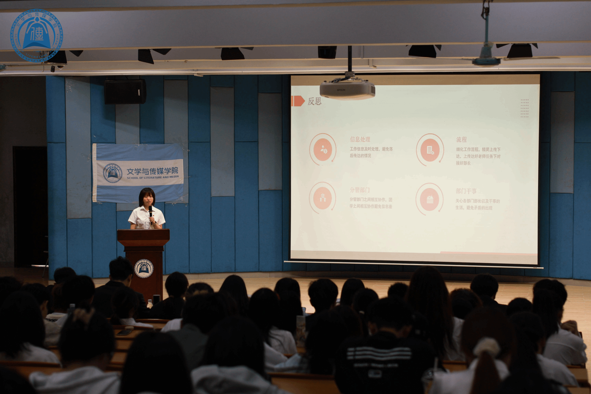 各主席团成员立足分管部门的工作实际,对上学期的工作开展情况进行了细致严谨的总结与深刻反思,全面展现了学期工作成效。在他们的统筹带领下,文传学院成功举办了“诗韵风华”大型展演活动,职业规划大赛、校史知识竞赛等大型比赛,宿舍走访,教学楼安全检查等日常工作也有序落地,各部门职责分明,运转高效,团学工作呈现欣欣向荣的良好发展态势。同时,他们直面工作中存在的不足,深刻剖析了沟通繁杂,跨部门合作困难等问题,明确了整改方向,对下学期团学工作的开展做出了系统严谨的规划和部署。