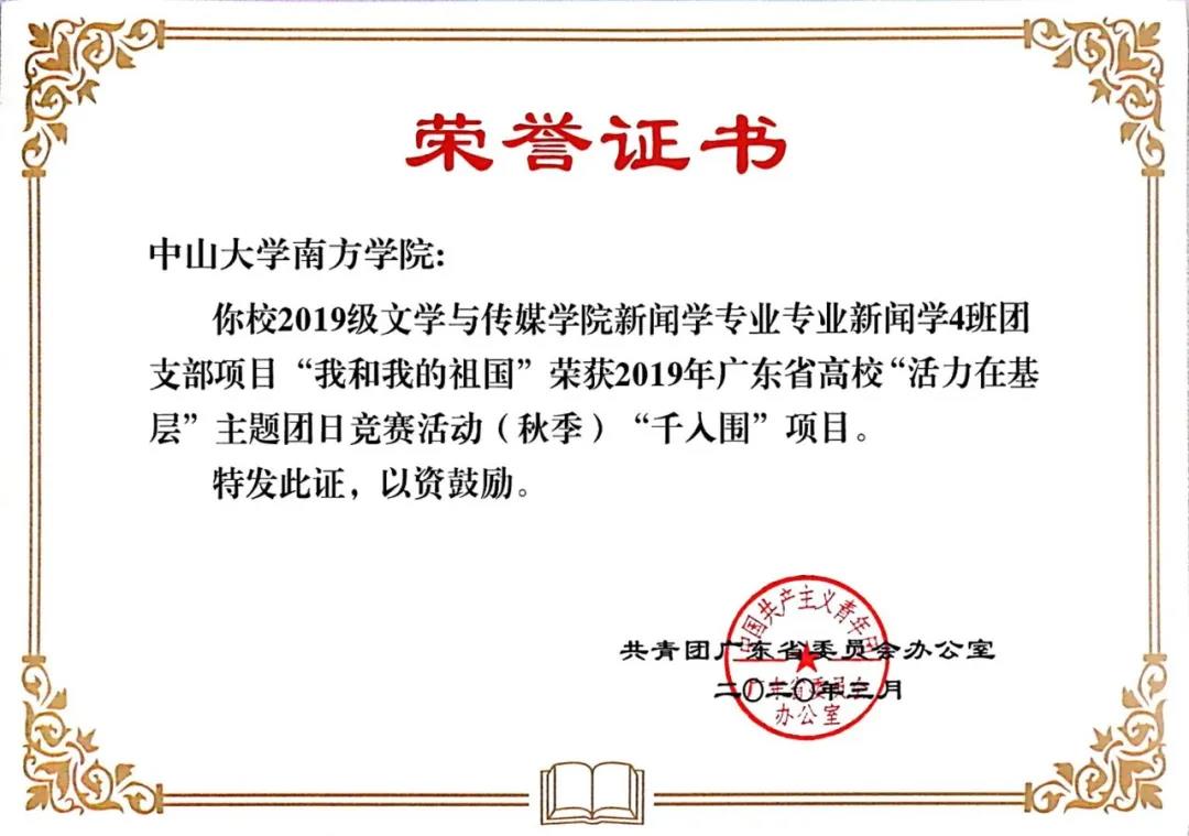 集体荣誉方面,除我院团总支获得“广东省五四红旗团支部”称号外,我院2017级汉语言文学1班团支部项目“党史趣味竞赛,拥抱新的时代”、2019级汉语言文学4班团支部项目“青春心向党,建功新时代”以及2019级新闻学4班团支部项目“我和我的祖国”分别荣获2019广东省高校“活力在基层”主题团日竞赛活动(秋季)“千人围”项目。这次获奖是对我院团总支、各班级团支部、共青团员的一次鼓励。荣誉的获得离不开文传师生的共同努力,也激励着我院共青团员更加努力地学习和提升自己,为学校、社会和国家做出自己的贡献。