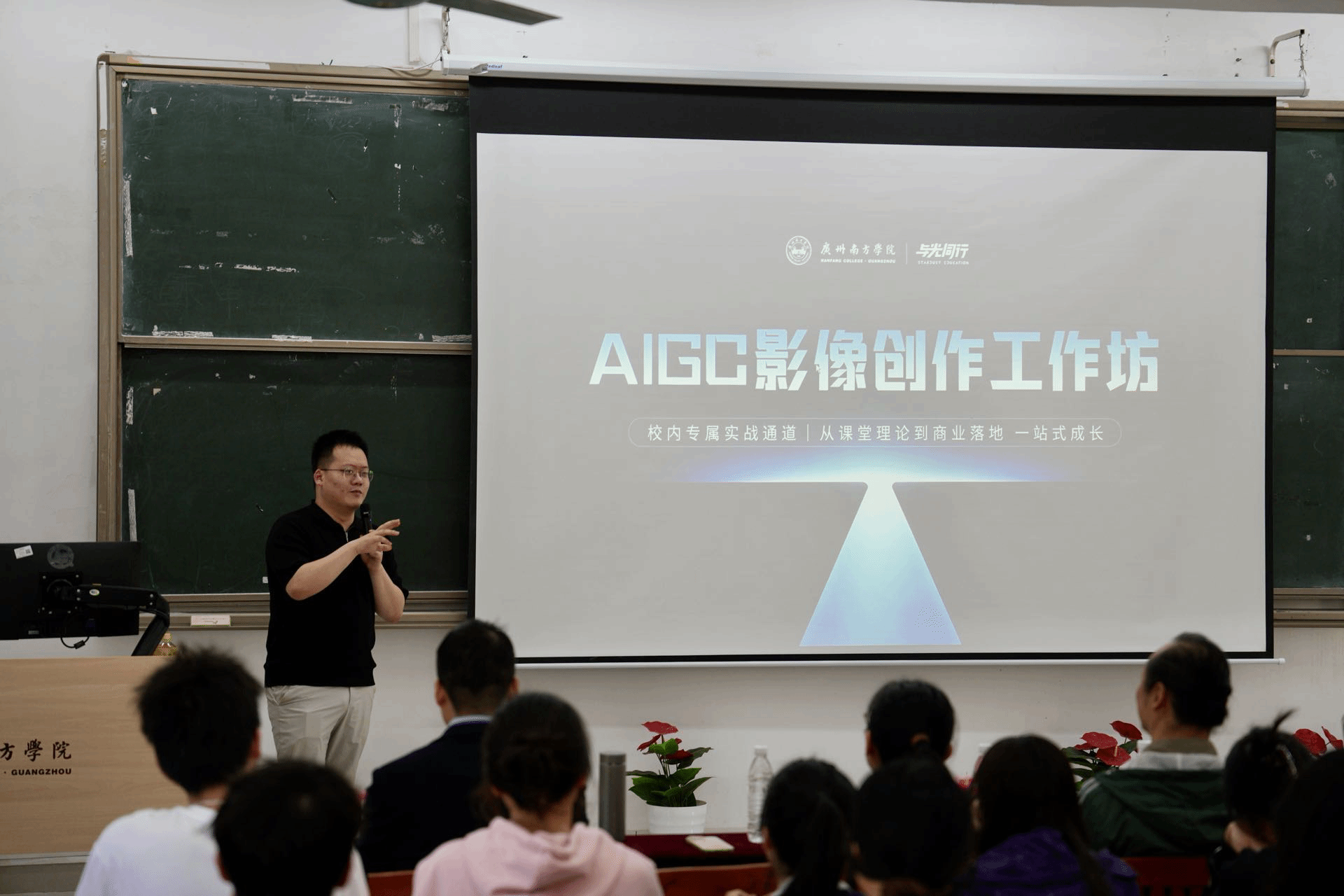 在主旨分享环节,与光同尘集团教育板块副总经理、AIGC项目管理总监何金铭先生围绕合作背景与工作坊规划进行了深入讲解。他首先点明了合作的现实背景:在AIGC浪潮下,公司的业务增长远快于自身人才的补充速度。因此,走进高校开展创新型人才的孵化,既是企业发展的需要,也是行业储备新生力量的重要途径。