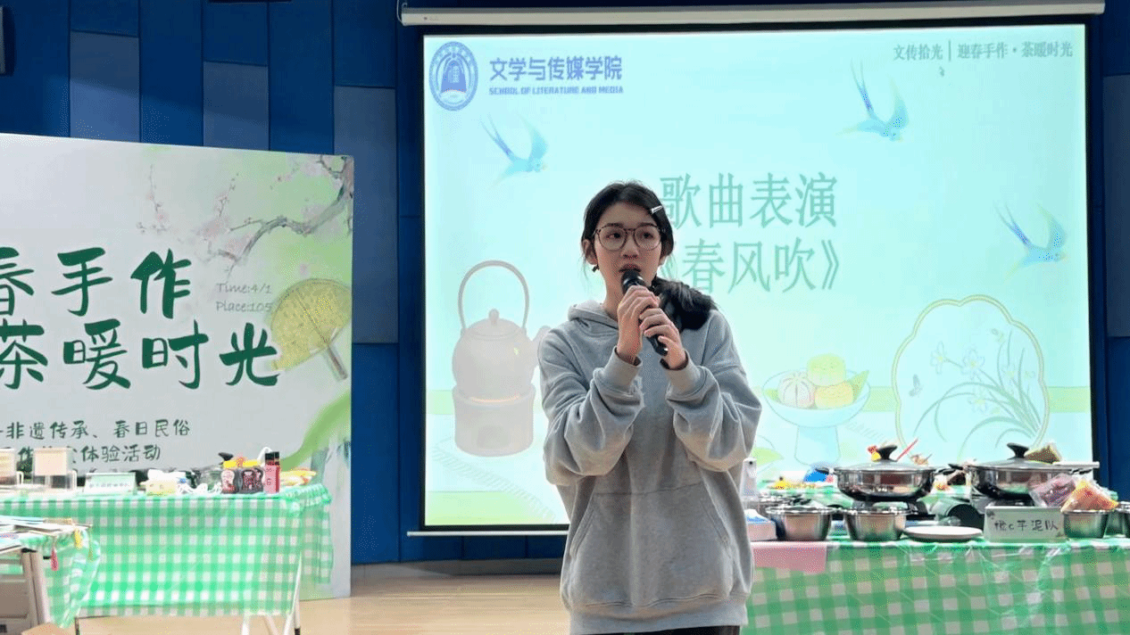 活动伊始,主持人任杰、饶嘉晋简要介绍了本次非遗民俗体验活动的初衷、流程及意义。随后,暖场互动环节温情开启,魅声歌唱队的赖依莎带来了一首清新悦耳的《春风吹》,为本次活动拉开了序幕,悦耳的歌声让现场的氛围迅速升温。欢声笑语间,师生情谊愈发浓厚,也为后续的环节奠定了轻松愉悦的基础。