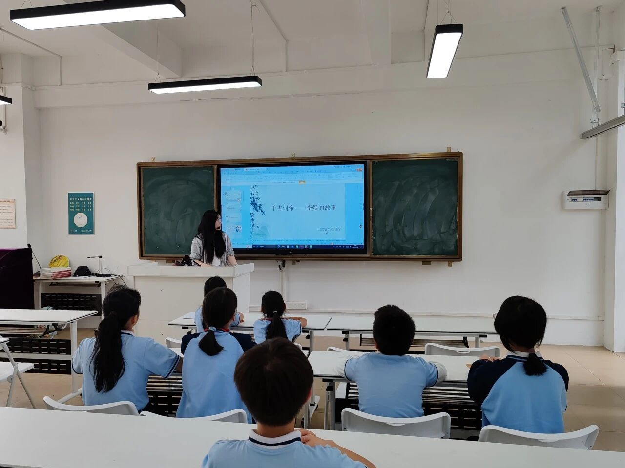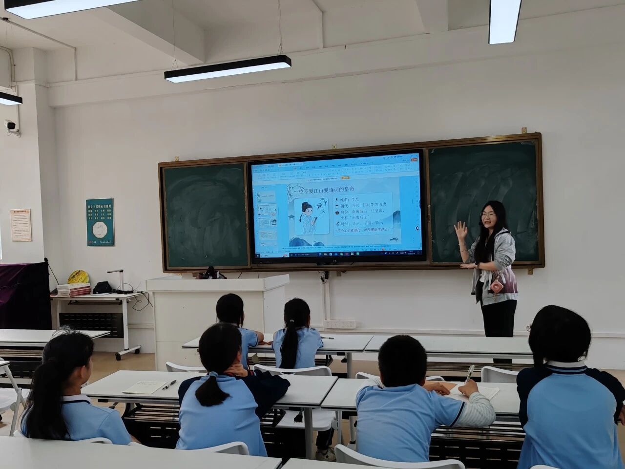 紧接着,小王老师循序渐进地带着同学们来到“解析诗意”环节,她层层剖析,让同学们从通俗易懂的解释中更好地把握诗意、体会诗人的情感。她还引导孩子们对比李煜前期与后期词作的风格变化:前期写宫廷繁华、风花雪月,后期写亡国之痛、人生悲慨,让孩子们看见“赋到沧桑句便工”的深刻内涵。