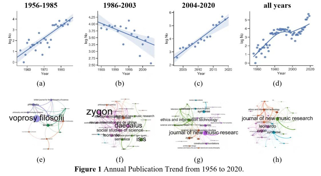 由许智超丶冯源丶廖汉腾丶及蒋晓琳发表的论文“跨时间绘制人工智能和大数据在艺术人文研究图谱” (Mapping Big Data and Artificial Intelligence in arts and humanities across time) 总结了1956年以来共2千多篇核心论文的文献计量内容,除了发现自冷战时期以来相关研究,到2004年以后新兴的如新音乐丶伦理学丶跨领域人文学等等的发展,特别是 Journal of New Music Research 及MIT出版的 Leonardo等,可归为四大发表聚类: 哲学/伦理学 丶艺术/意识丶音乐/科技丶伦理/科技。
