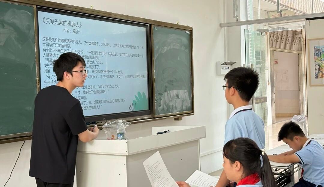 2026年3月26日,语言文字服务团队在刘涵玉老师的带领下走进善施学校,本次担任创意阅读与写作课堂小老师的是田思浩。本堂课,田老师以著名科幻作家星新一的《反复无常的机器人》为核心,带领同学们深入品读科幻小说的乐趣,启发了同学们的奇思幻想。