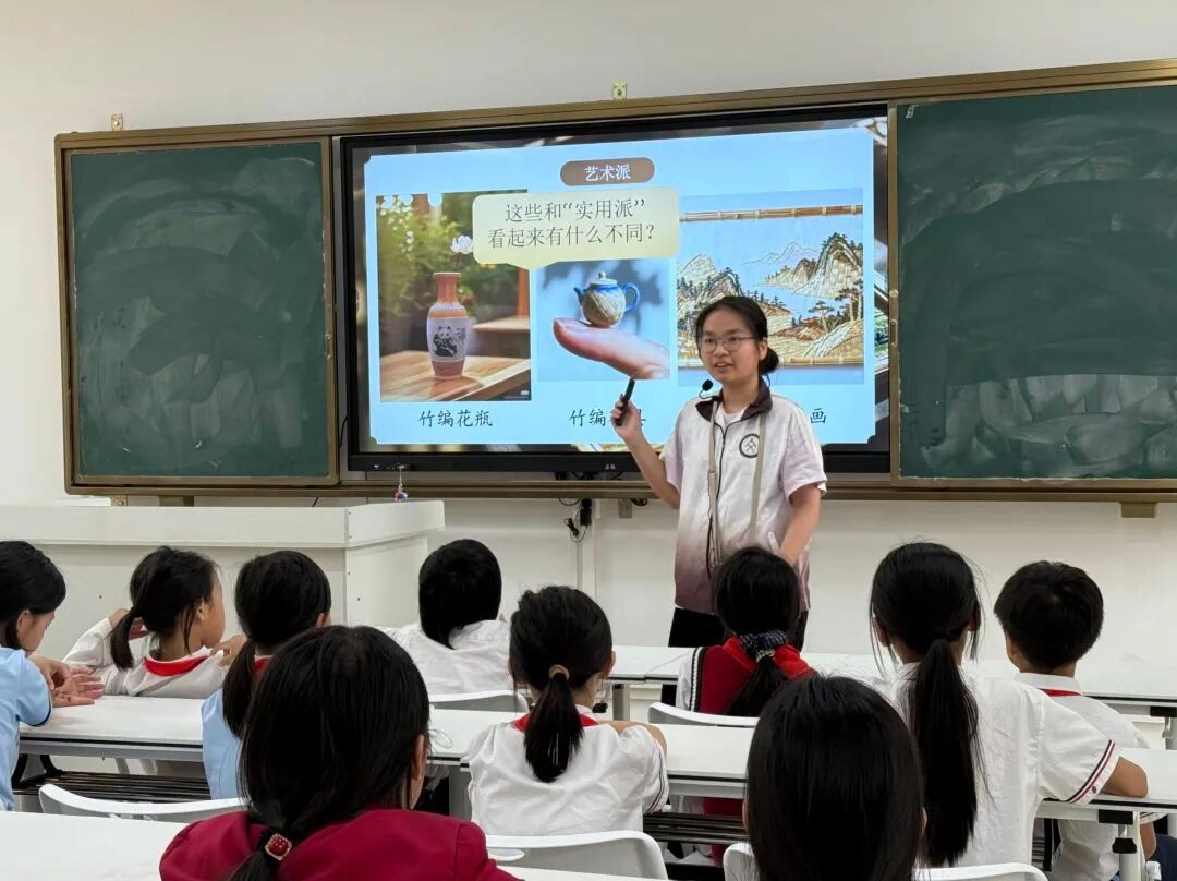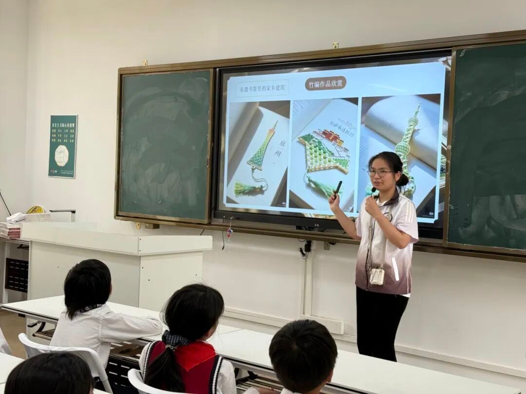 接下来,小卢老师从实用、艺术、情感三个方面分别讲解竹编的价值。从实用方面来看,竹编所编就的篮子能盛放许多东西;从艺术方面来看,竹编作品精致美观,给人独特的视觉体验;从情感方面来看,竹编承载了历史悠久的中华优秀传统文……竹编的多重价值,赋予了竹编旺盛而蓬勃的生命力。让小朋友们能更好理解竹编这项非遗技艺从古到今的无限魅力。