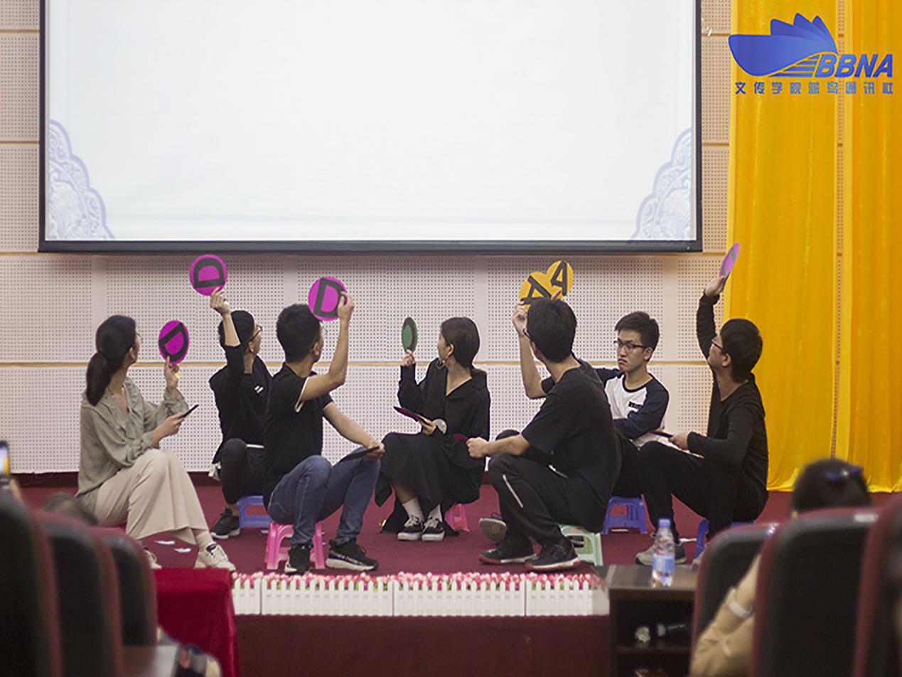紧接着进行的是观众答题环节,随着大屏幕上题目的出现,台下的观众纷纷举手,观众的踊跃答题展现了我院学子对知识的渴求。