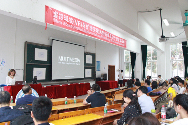 此外,企业代表庄嘉亮先生用视频为大家展示了VR技术的运用,程悦老师跟大家分享了《VR新闻的展望与风险》,突出了VR技术新闻报道的优势,同时她也介绍了VR技术新闻报道不可避免存在的风险和困境。