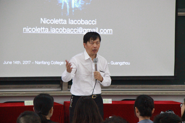 Dr. Nicoletta Iacobacci教授在韦伯斯特大学日内瓦分校教授新兴媒体课程,目前是暨南大学访问教授,承担虚拟现实叙事与虚拟现实新闻学教学。在主题演讲中,她介绍了工业革命的发展,并着重于当今第四次革命的创新,列举了如无人机、3D打印等指数型增长科技的例子。在介绍VR虚拟现实技术、AR现实增强技术、MR混合现实技术时,她用生动形象的例子为大家介绍了它们的定义与当今的应用。