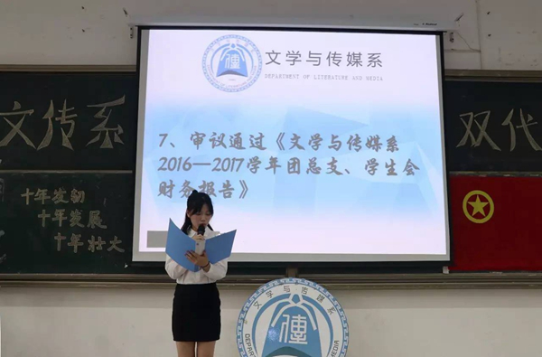 大会审议并通过了《大会筹备工作报告》、《文学与传媒系第九届团总支工作报告》、《文学与传媒系第十届学生会工作报告》、《文学与传媒系第九届团总支、第十届学生会财务报告》、《文学与传媒系团总支学生会组织架构改革议案》。