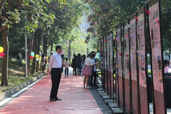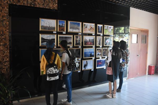 一教大厅是文传系学生优秀作品展。校友们纷纷驻足观望、合影留念,仿佛看到了当年的自己,那个一心想为文传争光的自己,那个懵懂青涩的自己。一系列精彩摄影作品不仅仅承载了文传十年来的成长变化轨迹,也表达了莘莘学子对文传的热爱。