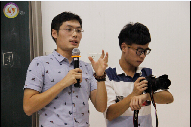 黄剑明老师主要从取景、镜头的剪接两个方面入手,向同学们传授新闻摄像的经验。在取景这方面,他表示需要根据拍摄要求的不同进行取景,例如近景主要适合访谈性节目,这样让观众有参与感,而特写的主要作业是抓拍到被采访者的面部表情等;在进行镜头的剪接时,要注意景别的逐层递进,即全景到特写的变化,还要注意不要越轴等问题;在进行运动镜头拍摄的时候借助工具,减少镜头的浮动。为让同学们全面吸收授课内容,黄老师还让同学拿单反上台进行现场指导。