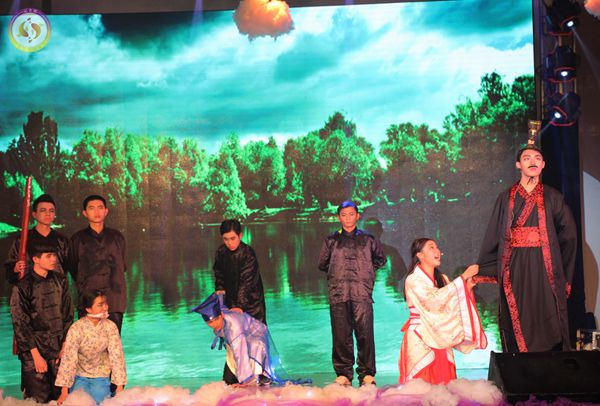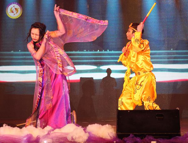 紫阳戏剧社的音乐剧《魔盒奇境》、现代搞笑小品《中国合伙人》、话剧《湘女说》均由学生根据中外神话传说改编而成,节奏紧凑,剧情引人入胜,表演出色,赢得观众阵阵喝彩,《中国合伙人》改编《西游记》的经典桥段,融入现代元素,趣味横生、活灵活现。